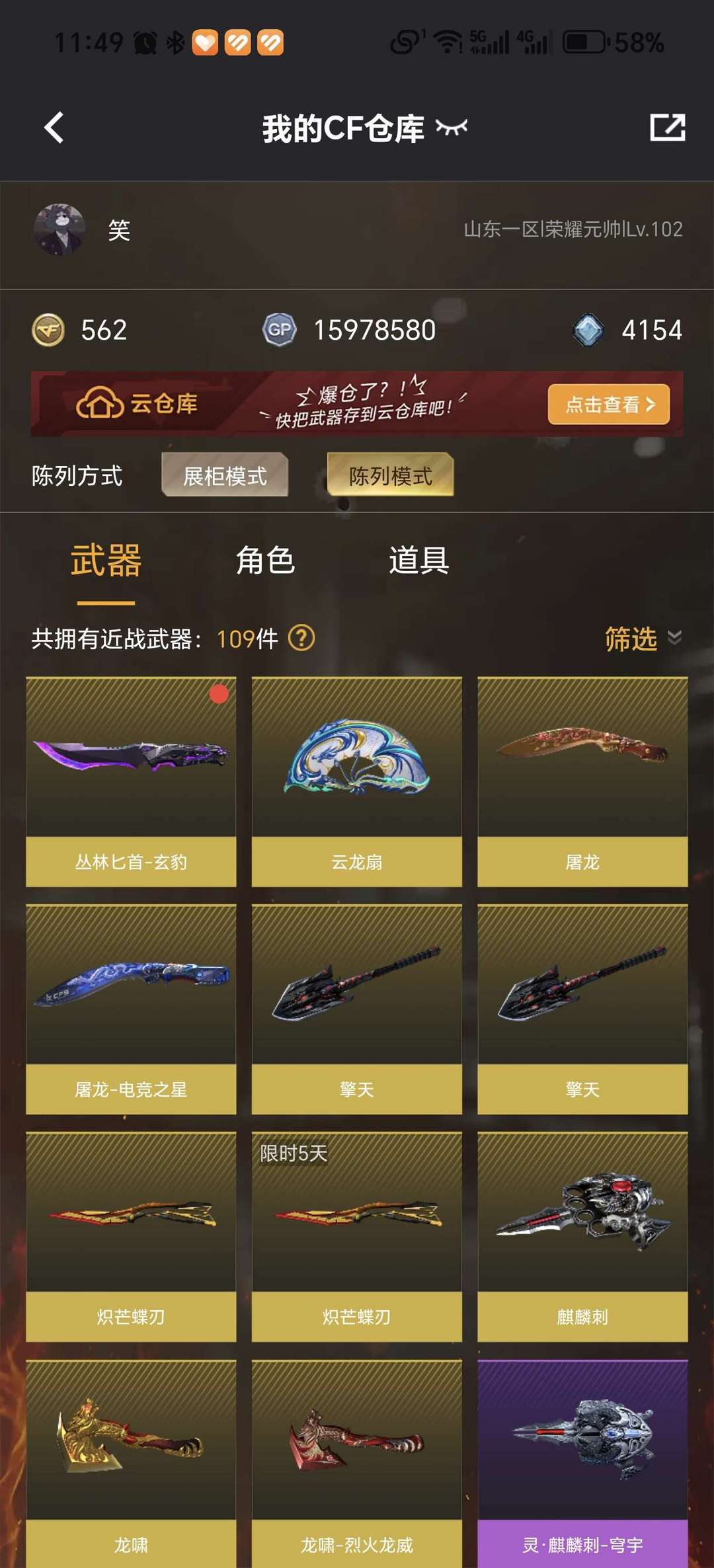 限制: 租号5次及以上 |装备描述:60V,5烈龙蝴蝶,炽芒蝶刃,毒蝰术士,机械终极猎手皮肤,爆破幻神AG,裁决,满子弹cop,云龙套装,白虎玄豹,加利尔天袭,4防角色雨墨,宗师段可排位