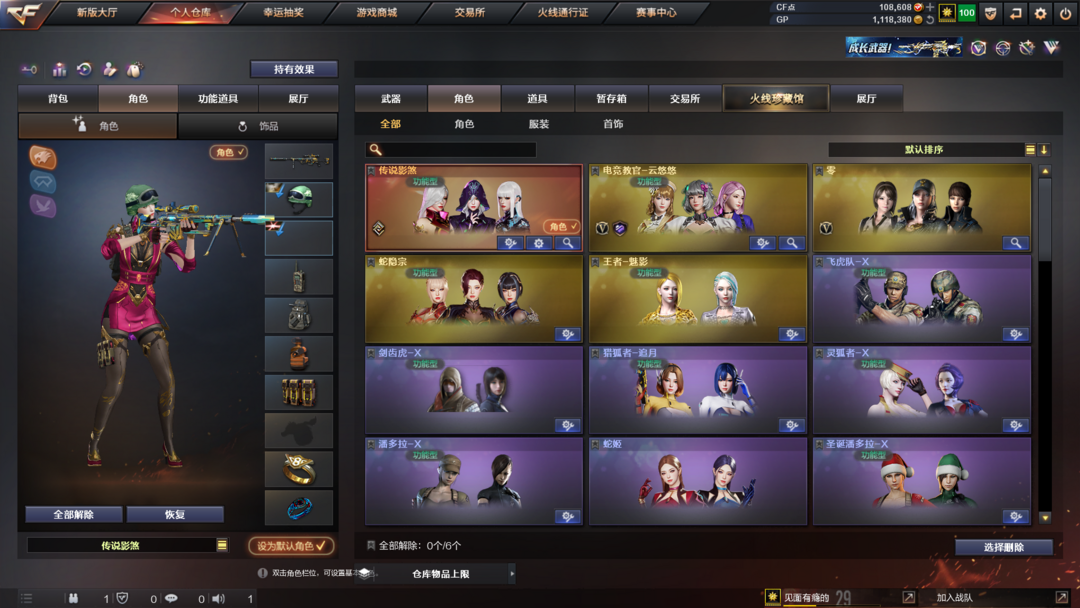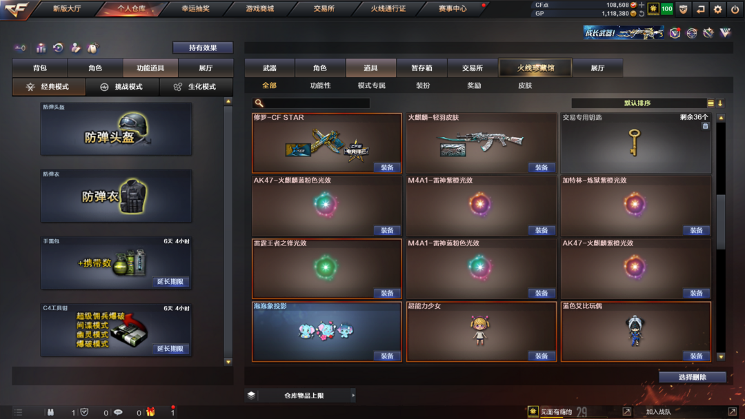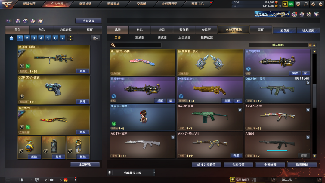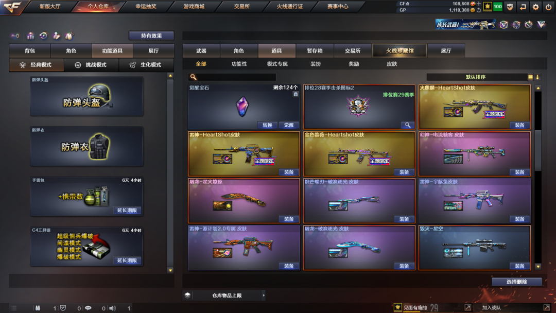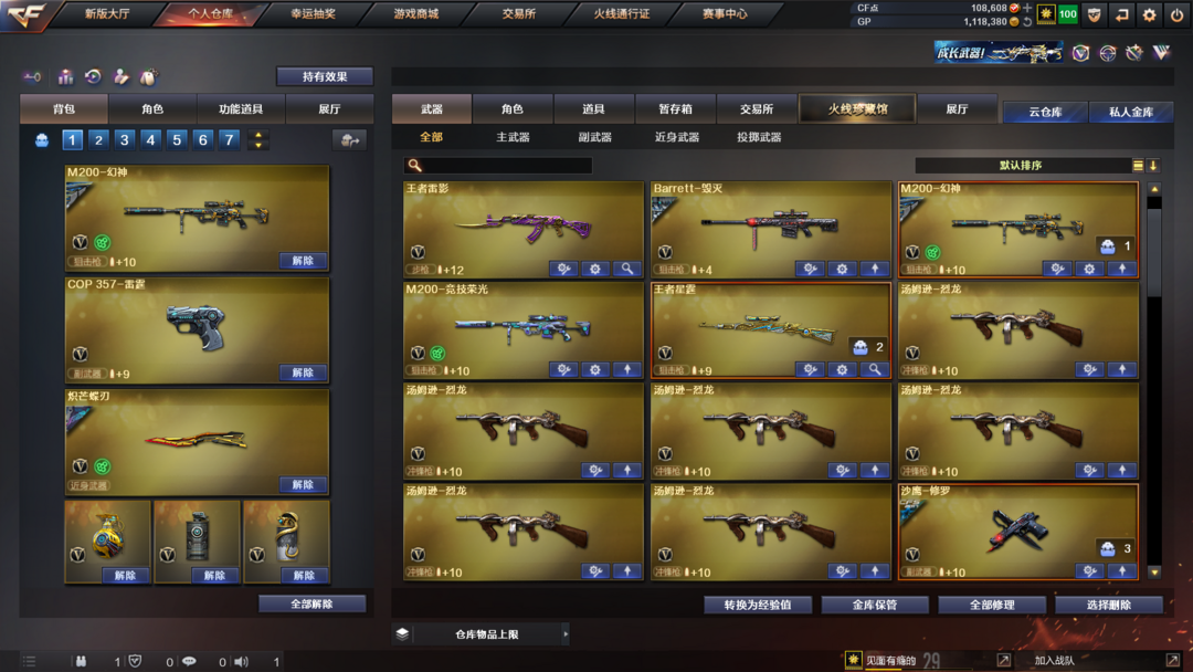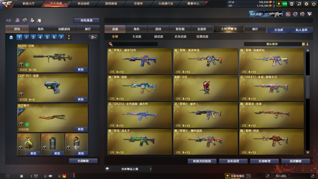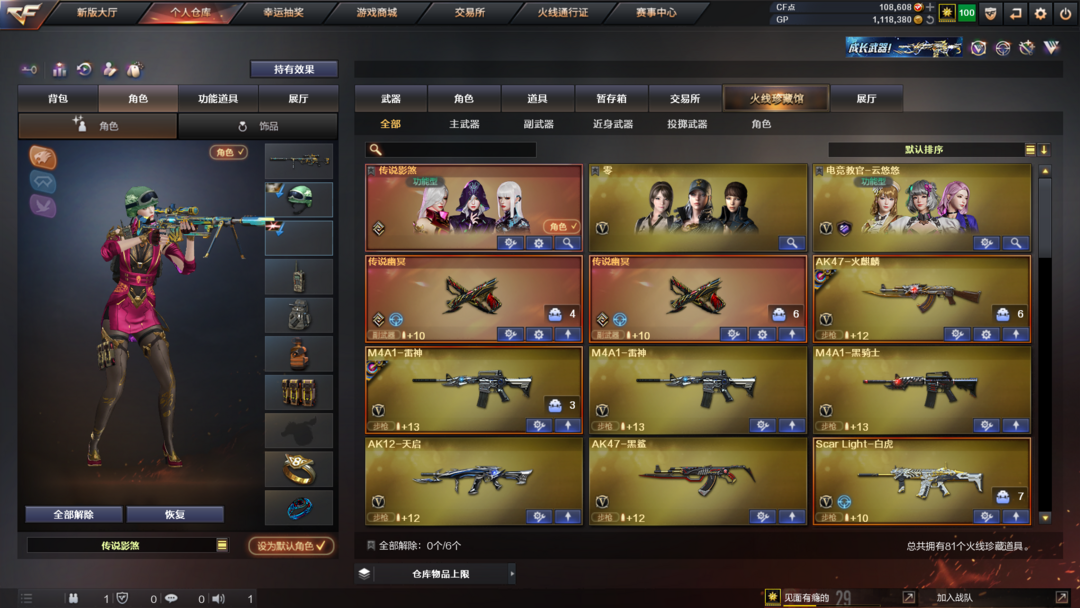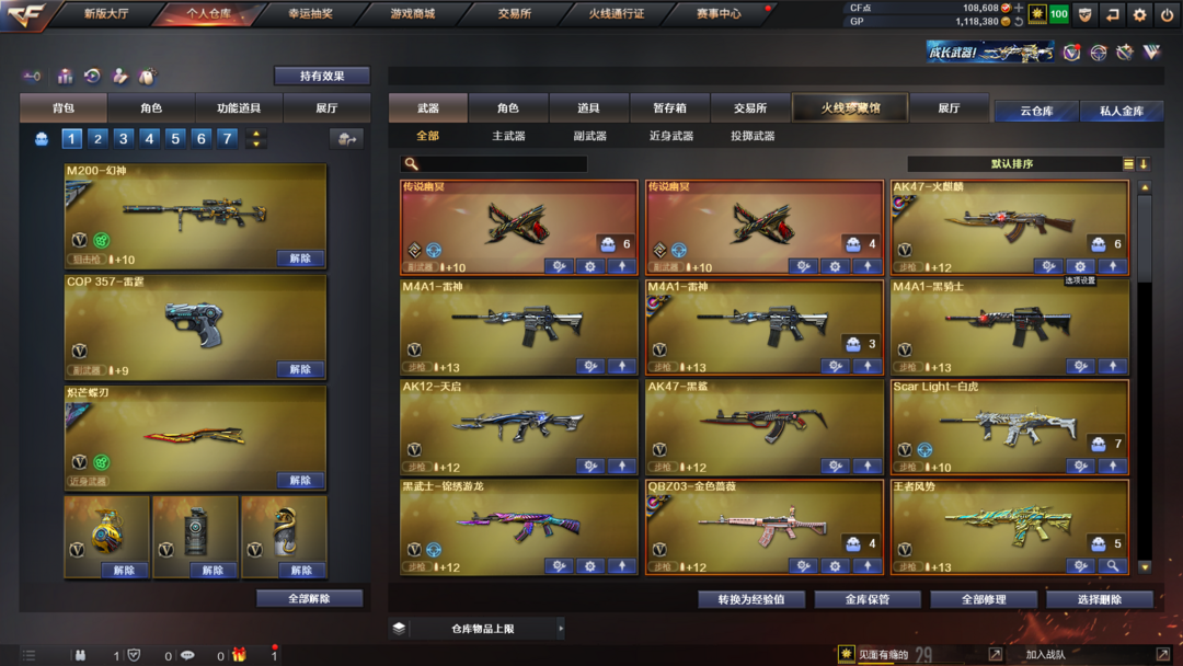 装备描述:王者武器:王者风势-觉醒版;王者雷影;雷霆王者之锋-觉醒版;高爆手雷-雷霆王者;烟雾弹-雷霆王者-觉醒版;王者星霆;炫金千变 英雄武器:M200-幻神;汤姆逊-烈龙;Scar Light-白虎;雷霆之契;传说幽冥;麒麟刺;M4A1-雷神;炽芒蝶刃;柯尔特-竞技荣光;闪光弹-竞技荣光;高爆手雷-竞技荣光;烟雾弹-竞技荣光;M200-竞技荣光;擎天-竞技荣光;M4A1-黑骑士;Barrett-毁灭;AK47-黑鲨;AK12-天启;擎天;QBZ03-金色蔷薇;烟雾弹-云龙;高爆手雷-云龙;云龙扇;闪光弹-云龙;高爆手雷-雷霆;雷霆之锋;高爆手雷-雷暴;USP-雷暴;斩神刀-雷暴;闪光弹-雷暴;烟雾弹-雷暴;烟雾弹-雷霆;闪光弹-雷霆;黑武士-锦绣游龙;屠龙;沙鹰-修罗;AK47-火麒麟 角色:零;电竞教官-云悠悠;传说影煞;猎狐者;飞虎队;幻影;雷霆-β;复仇者;堕天使;威锋;王者-魅影;夜玫瑰-X;剑齿虎-X;圣诞潘多拉-X;幽;超能特工;猎狐者-追月;夜玫瑰-宠粉