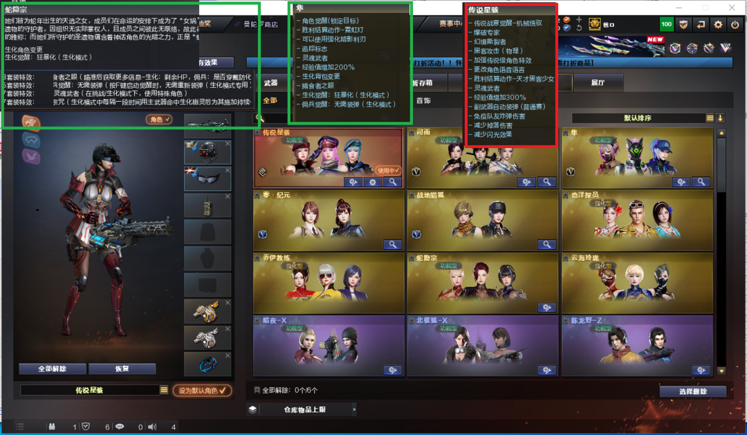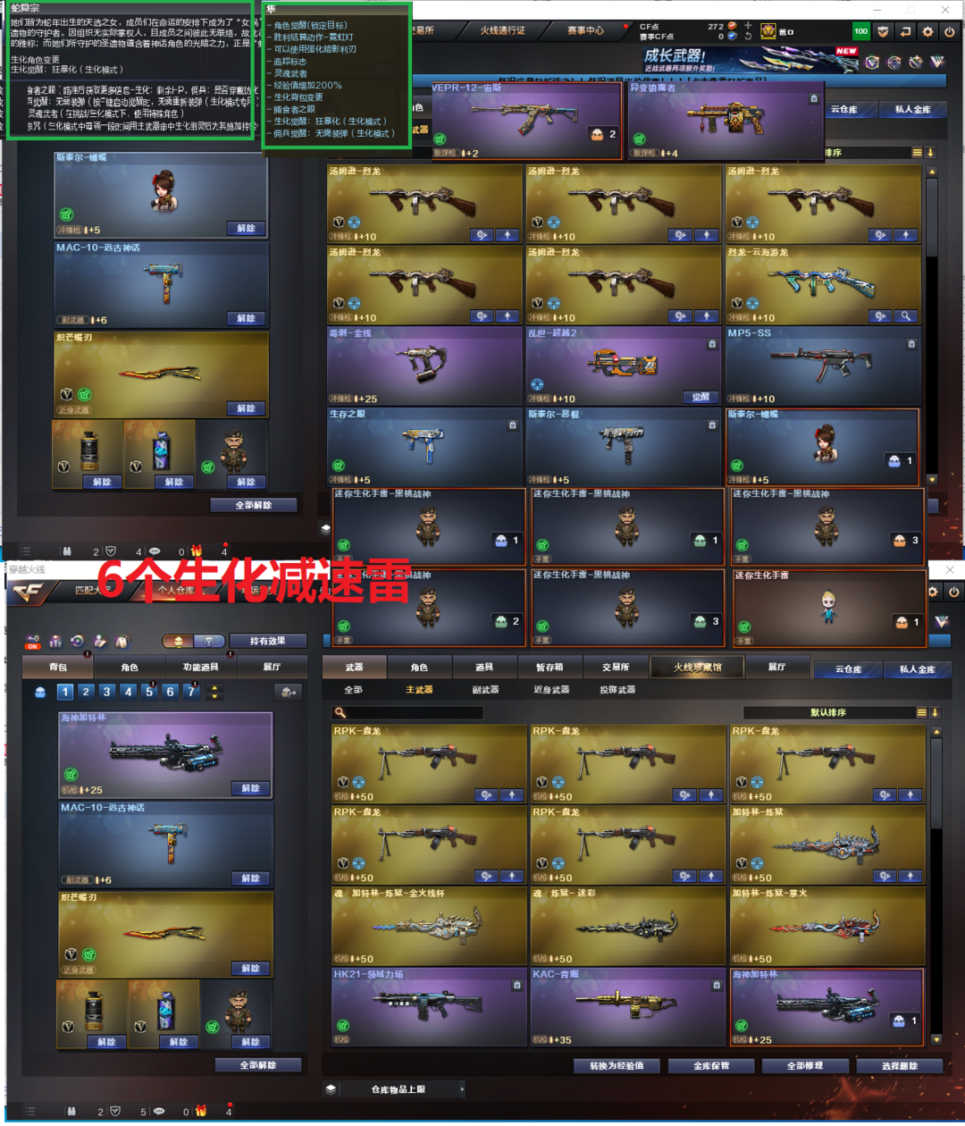 装备描述:排位:可以、、、、、、、生化四防(可以变更背包、查看生化僵尸血量):无需换弹、6烈龙、5盘龙、炼狱、斯泰尔蝴蝶、VPER-12-宙斯、异变镇魔者、HK21-领域力场、海神加特林、死亡之眼、MAC-涂鸦、炽芒蝶刃、手斧镜、6个生化减速雷、超级对讲机、全部弹匣、、、、、、、、爆破四防:幻神3皮+音效(星耀、纸灯龙、黄忠皮肤)、98K星神、、、USP雷暴、、、、FAMAS G2-天戎、QBZ03-独角、G36幻影、QBZ191-银翼、白虎、QBZ金色蔷薇、、、幻神音效、裁决音效、毁灭音效、黑骑士音效、、、1套雷霆、4套雷暴、1套堕天神、1套幻灵、2套竞技荣光、、、生化四防(传说星骇、司雨)、爆破四防(隼、蛇影宗)