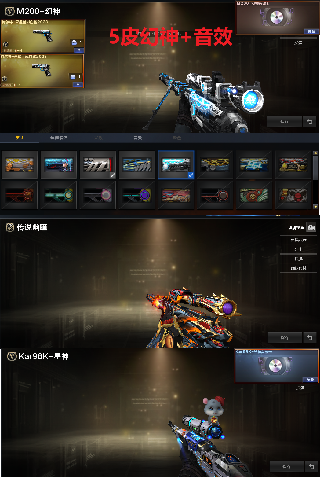 装备描述:排位:可以、、、、、、、、、爆破四防:幻神5皮+音效(23白鲨、星耀、白鲨、电流骇客、黄忠皮肤)传说幽瞳、M200-竞技荣光、98K星神、、、、、2把23白鲨柯尔特、、、、G36幻影、QBZ金色蔷薇、、、幻神音效、星神音效、毁灭音效、黑骑士音效、、、2套竞技荣光、1套神工天巧、、、爆破四防(王者炫)