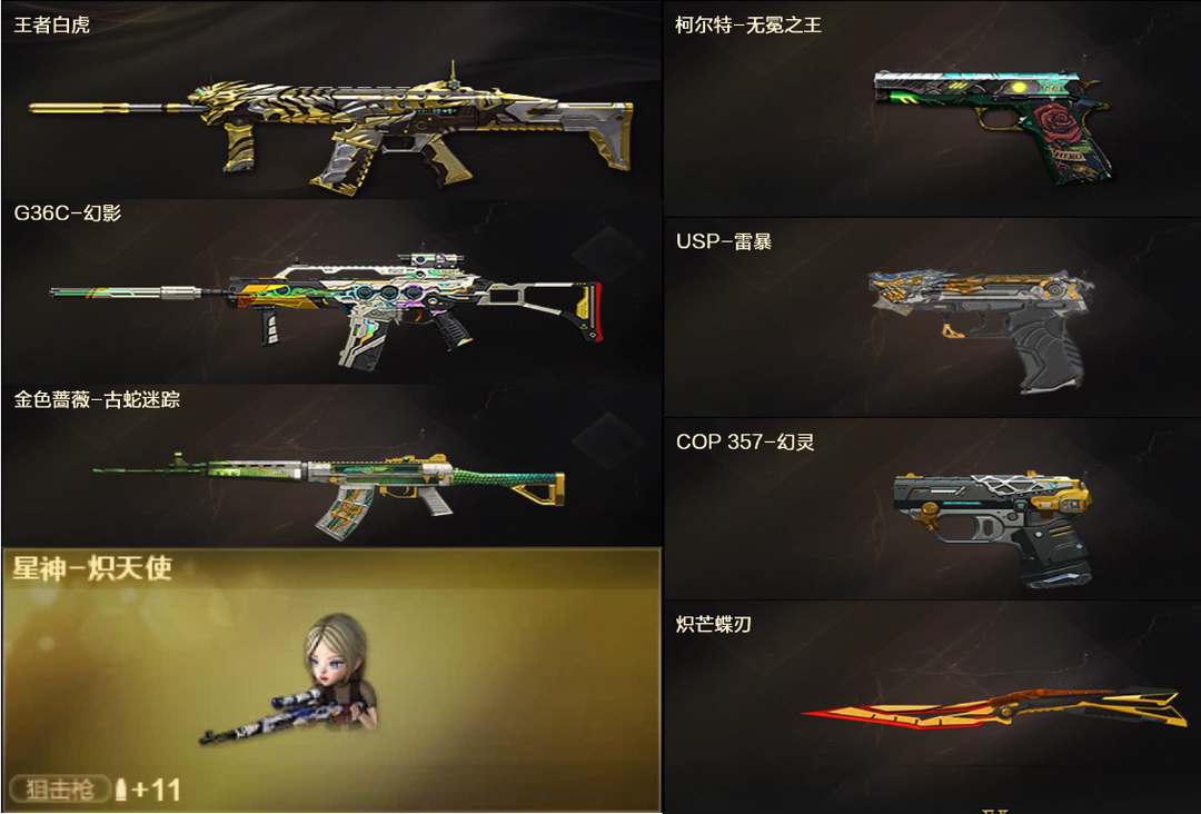 传说圣谕✨幻神曹操+裁决运输船音效+星神炽天使✨QBZ蔷薇3皮+幻影白虎✨柯尔特USP炽芒✨4防司雨