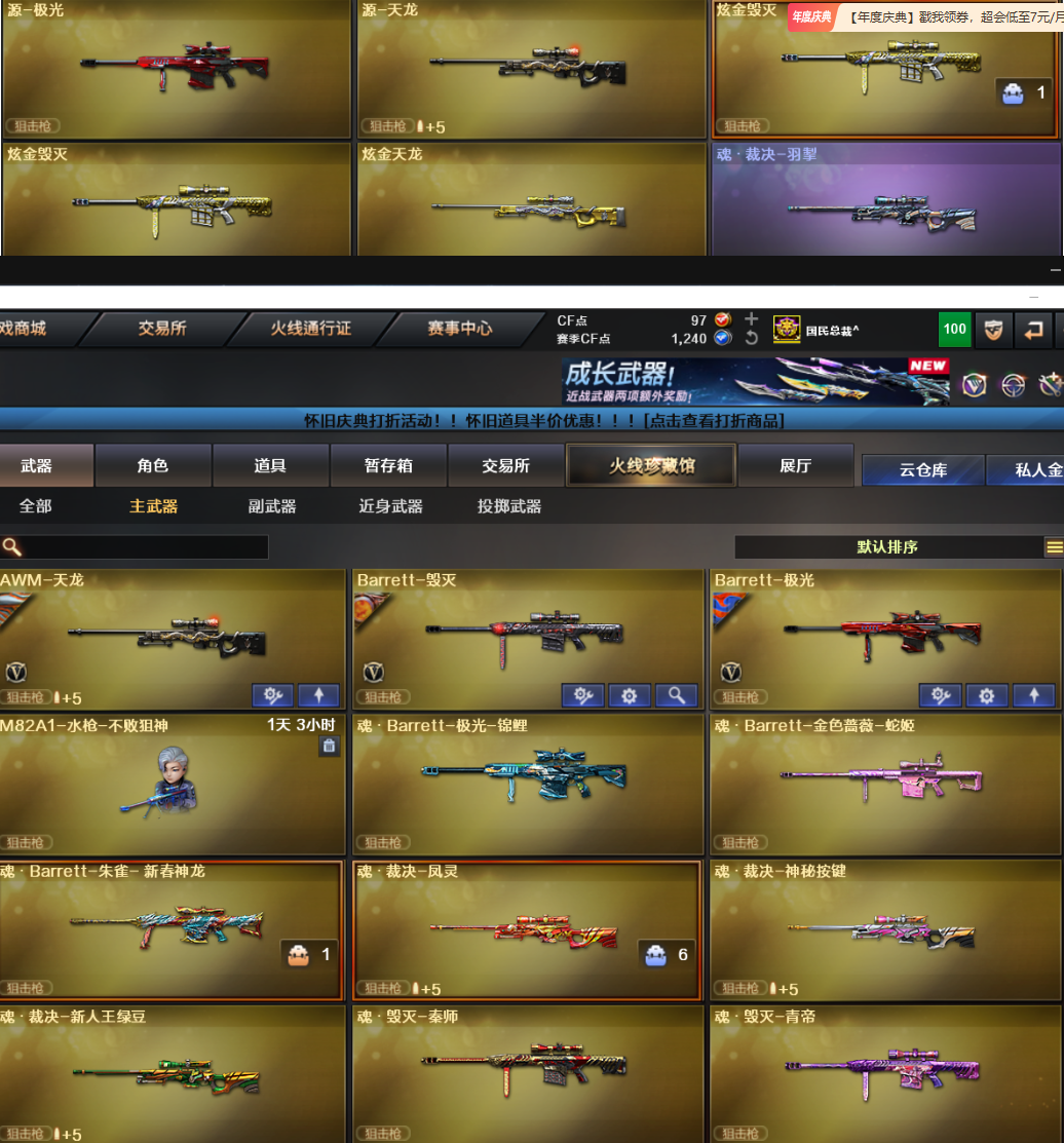 装备描述:王者武器:炫金天龙;炫金毁灭;王者-零; 英雄武器:Barrett-毁灭;Barrett-极光;AWM-天龙;M4A1-雷神;M4A1-黑龙;AK47-无影;AK47-火麒麟;M4A1-千变;M4A1-死神;沙鹰-天神;沙鹰-修罗;屠龙;擎天;龙啸;麒麟刺;屠龙-动感闪耀;天神-动感闪耀;手雷-动感闪耀;机械迷城-穹宇;无影-神兵利器; 角色:王者-零;堕天使;活力灵狐;G.E.M.邓紫棋;夜玫瑰;威锋;陈龙野-X;新斯沃特-英特尔;猎狐者-英特尔;娜塔莎;救世复仇;救世主;精英部队;灵狐者;烈锋;王力宏;影武者;影武者-X;雷豹;龙儿;救世主-X;蜀雪;潜龙队-X;剑齿虎;暗夜-X;陈龙野-Z;剑齿虎-X;圣诞潘多拉-X;潘多拉-甜心教官;风暴女;嘉年华灵狐;刀锋-京韵;猎狐者-X;斯沃特精英;金戈;潜龙队;铁骑猎狐者;飞虎队;刀锋;潘多拉;幻影;波塞冬; 道具:步枪弹匣;生化弹匣;彩蝶之翼;防弹衣;妖姬;弦波科技无线电;云山科技背包;听风战术耳机;智眸战术目镜;绿色巨人;疯狂宝贝;防化服;C4工具钳;手雷包;防弹衣;防弹头盔;灵魂忍者;迷雾幽灵;严禁开挂必究,账号已绑定警全中心
