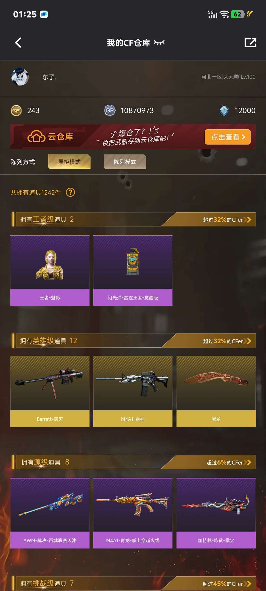 装备描述:幻神 雷神 毁灭 qbz金色蔷薇 屠龙 尼泊尔雷霆 金色蔷薇大炮 王者魅影 g36c幻影 幻神皮肤电子骇客 屠龙荣耀皮肤 毁灭荣耀皮肤 王者雷霆闪