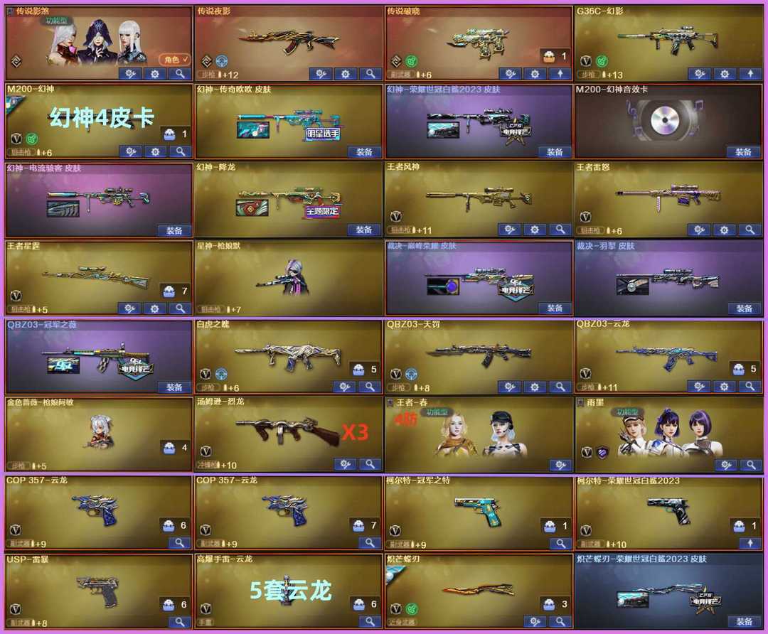 限制: 租号2次及以上 | 撤单率<60%才可租用此帐号装备描述:影煞幻神欧欧新白鲨④皮卡/裁决巅峰王者星霆风神/G36C幻影白虎之魄冠薇夜影/冠特雷暴雲龙套炽芒白鲨