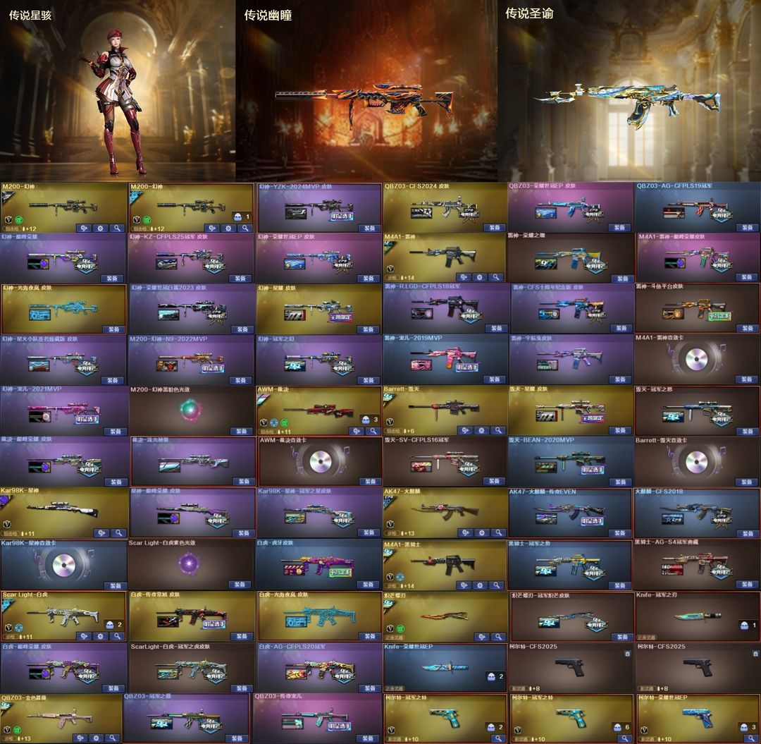 【东部】传说星骇+幽瞳⭐幻神光海12皮⭐裁决星神套⭐白虎光海+蔷薇套⭐天袭幻影天戎⭐冠特*6⭐蝴蝶刀