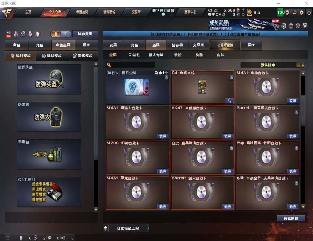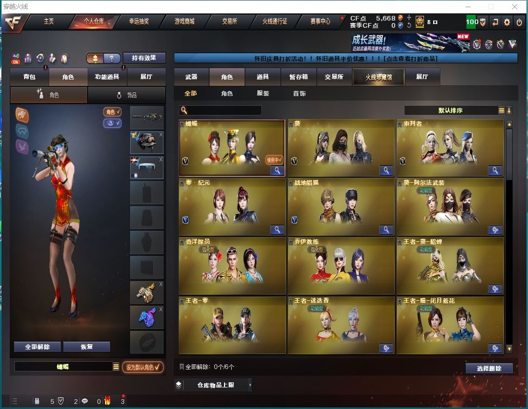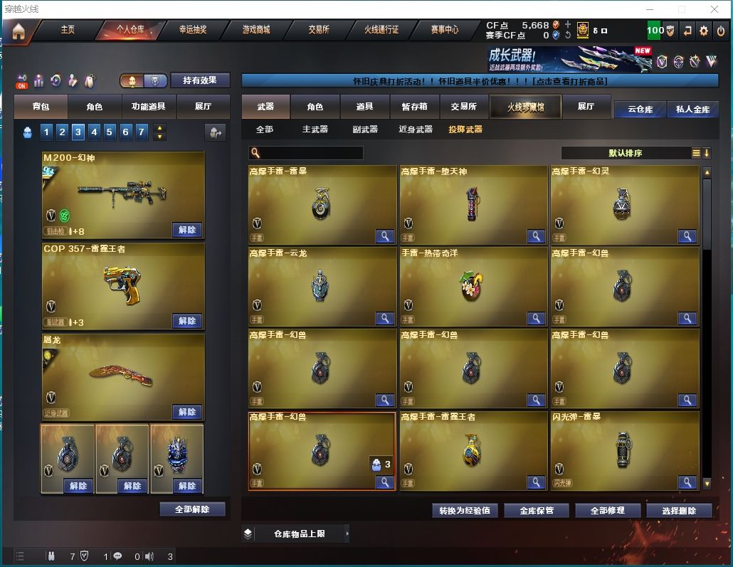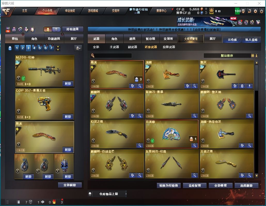 装备描述:英雄武器数:100V 王者武器数:9王者 幻兽套装数:5 会员等级:6 2黑骑士,5修罗 王者武器:王者之心,王者之势,王者之锋,王者之力,王者之魄,王者之翼 特殊武器:幻神M200,AK火麒麟,M4A1雷神,巴雷特毁灭,破空枪刃,朱雀HK417 稀有角色:王者魅影,王者迷迭香,海豹突击队,幻影,复仇者,堕天使,蝴蝶,审判者葵,王者零,雅典娜 ,王者瞳闭月羞花,稀有道具和皮肤:毁灭音效卡,黑龙音效卡,宠儿皮肤,荣耀套,清道夫斯太尔.冠军套,世冠套,幻神世冠皮肤。cfs2017,王者雷套,王者冰魄,王者火魄。