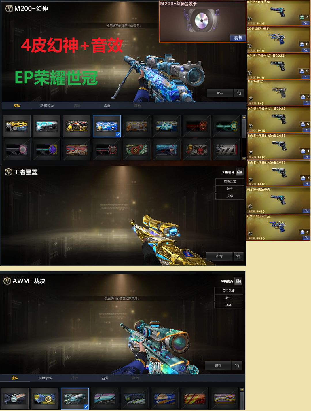 装备描述:排位:可以-------------生化全装(可以变更背包、看僵尸血量): 无需换弹、6烈龙、6盘龙、炼狱、双面神、异变清道夫、死亡之眼、斯太尔-蝴蝶、MAC-涂鸦、炽芒蝶刃、生化雷、-------------爆破四防:幻神4皮+音效(EP荣耀世冠、AG、23白鲨、周瑜皮肤)、王者幻神、王者星神、M200-竞技荣光、、、4个23白鲨世冠柯尔特、USP雷暴、2个COP云龙、2个柯尔特竞技荣光、、QBZ金色蔷薇、白虎、传说暗裔、、、幻神音效、雷神音效、黑骑士音效、、、7套竞技荣光、2套雷霆王者、、、生化人物(荒漠琉璃、蛇隐宗6防人物)、爆破四防(传说艾莉莎、王者迷迭香、零热舞青春、职业经理)