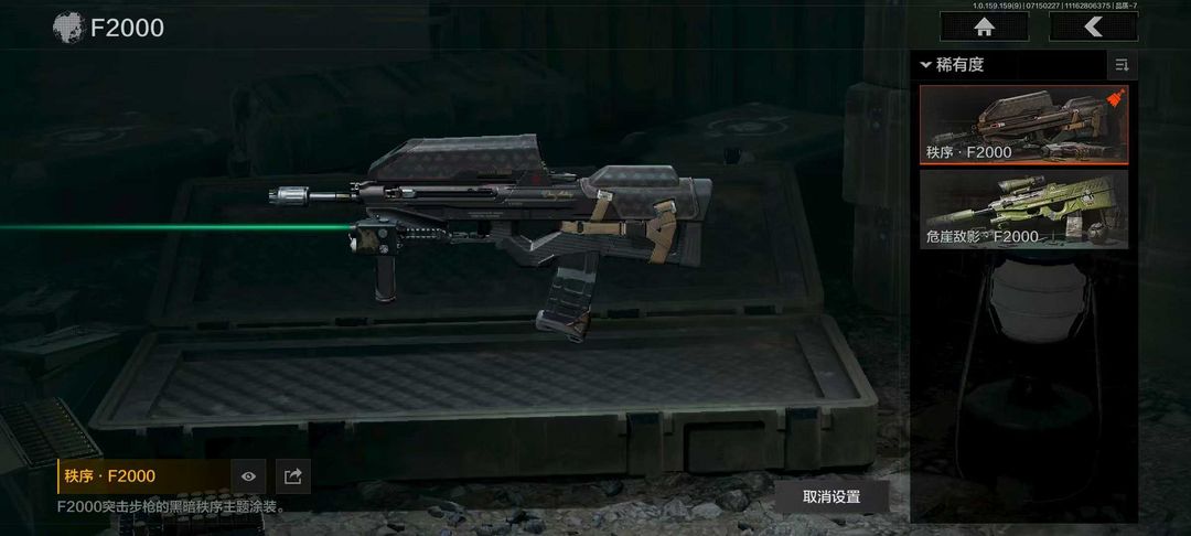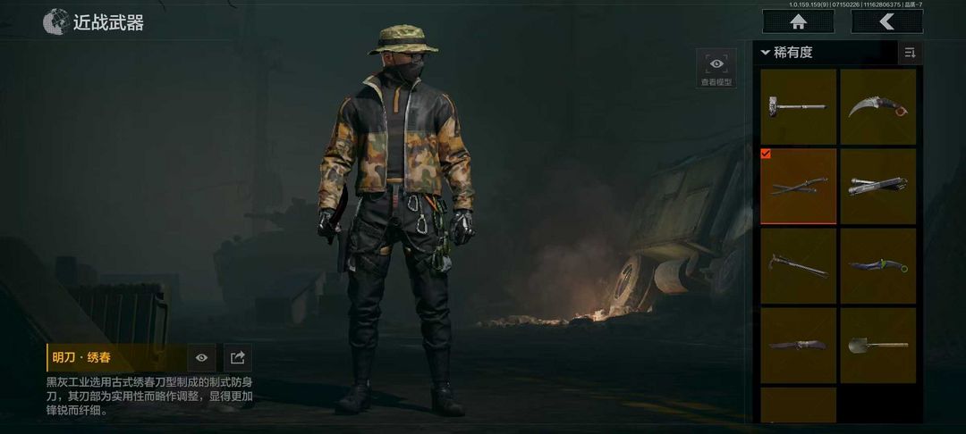 装备描述:旧日主宰,下弦月,明刀绣春,龙魂双节棍,裁决手杖剑,急袭弯刀,野战折刀,苍白之触,危崖魅影作战服,龙魂武术运动服,绅士西服,万众狂欢套装,森林守望特种服,边境看守,午夜梦魇FAL,蓝色咆哮H416,秩序F2000,来战AKM,骑士之剑AKS74U,火绒草AUG,无声暗月AR57,林地数码T03,玄戈梨花T03,龙威MP5