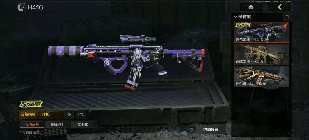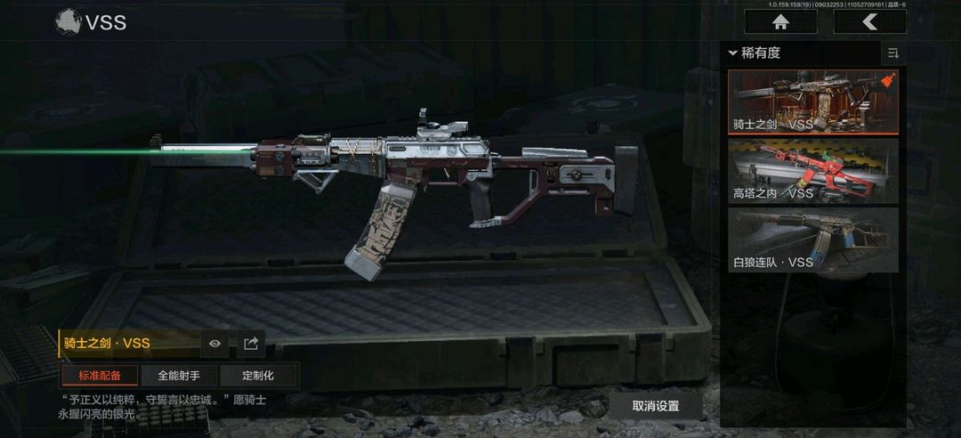 装备描述:正义战士特摄戏服,噤声者吉利服,万众狂欢套装; 突击步枪:竞技FAL,午夜梦魇FAL,蓝色咆哮H416,旗帜AEK,棱光裂变AKM,竞技M4A1,北国内卫MDR,逆火MDR,自喷网格H416,德尔塔小队H416,棱光裂变AK102,火力倾泻AUG,竞技AUG,极恶AUG,棱光裂变AK74N,来战AK74N,山地伪装AK74N,莫克斯AKS74U,骑士之剑AKS74U,最后防线AKS74U,赢家F2000,炎夏浪花AR57,涂绘猎人AR57,战术大师ACE31,骑士之剑ACE31,暴虐AEK,北国内卫AN94,百锻寒芒T951,百锻寒芒T03,缟兵玄墨T03,林地数码T03,07式林地迷彩QBZ191; 冲锋枪:掌中盾MP5,玄戈梨花MPX,高塔之内P90,灰鼠幻歌P90,神锋Vector45,恶念Vector9;射手步枪:骑士之剑VSS,棱光裂变QBU191,高塔之内VSS,白狼连队VSS,骑士之剑MK14,竞技M110,午夜梦魇M110
