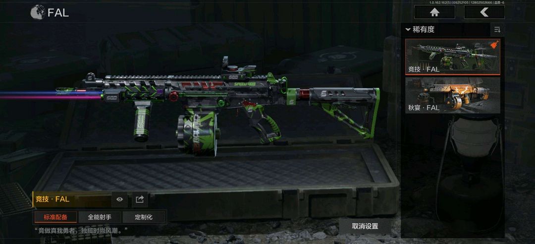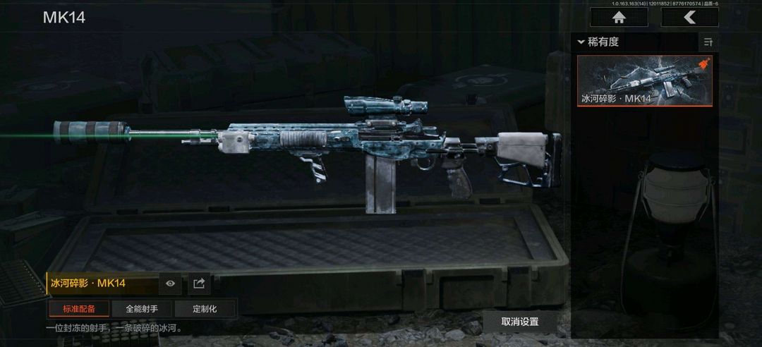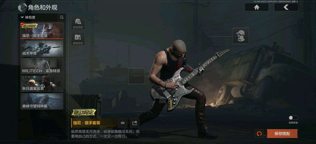 装备描述:强尼银手套装,战术甲胄,MILITECH紧急特派,秋日盛宴风衣; 竞技FAL,告丧夜曲AUG,旗帜AEK,棱光裂变AKM,来战AKM,骤羽尖啸M4A1,德尔塔小队M4A1,炎夏浪花H416,自喷网格H416,竞技MDR,北国内卫MDR,棱光裂变AK102,竞技AUG,极恶AUG,棱光裂变AK74N,来战AK74N,骑士之剑AKS74U,最后防线AEK,炎夏浪花AR57,涂绘猎人AR57,棱光裂变ACE31,骑士之剑ACE31,湖冰倒影ACE31,北国内卫AN94,阴影AN94,彻甲铜斑T951,玄戈梨花T03,彻甲铜斑T03,林地数码T03,骤羽尖啸AK12,07式林地迷彩QBZ191; 高塔之内P90,涂鸦MPX; 骑士之剑VSS,冰河碎影MK14,棱光裂变QBU191,高塔之内VSS,缟兵玄墨M110,全地形数码M110; 棱光裂变莫辛,危险猎手莫辛,轰炸小子AX50,骑士之剑SJ16; 秩序G18C