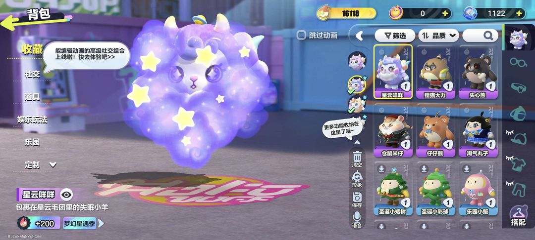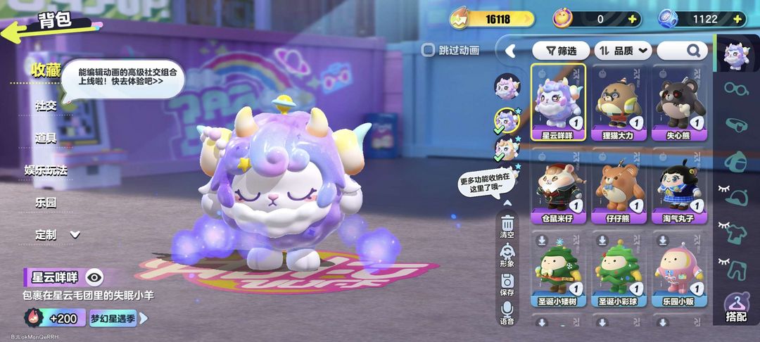 装备描述:星云咩咩全皮肤,失心熊,狸猫大力,仓鼠米仔,淘气丸子,仔仔熊