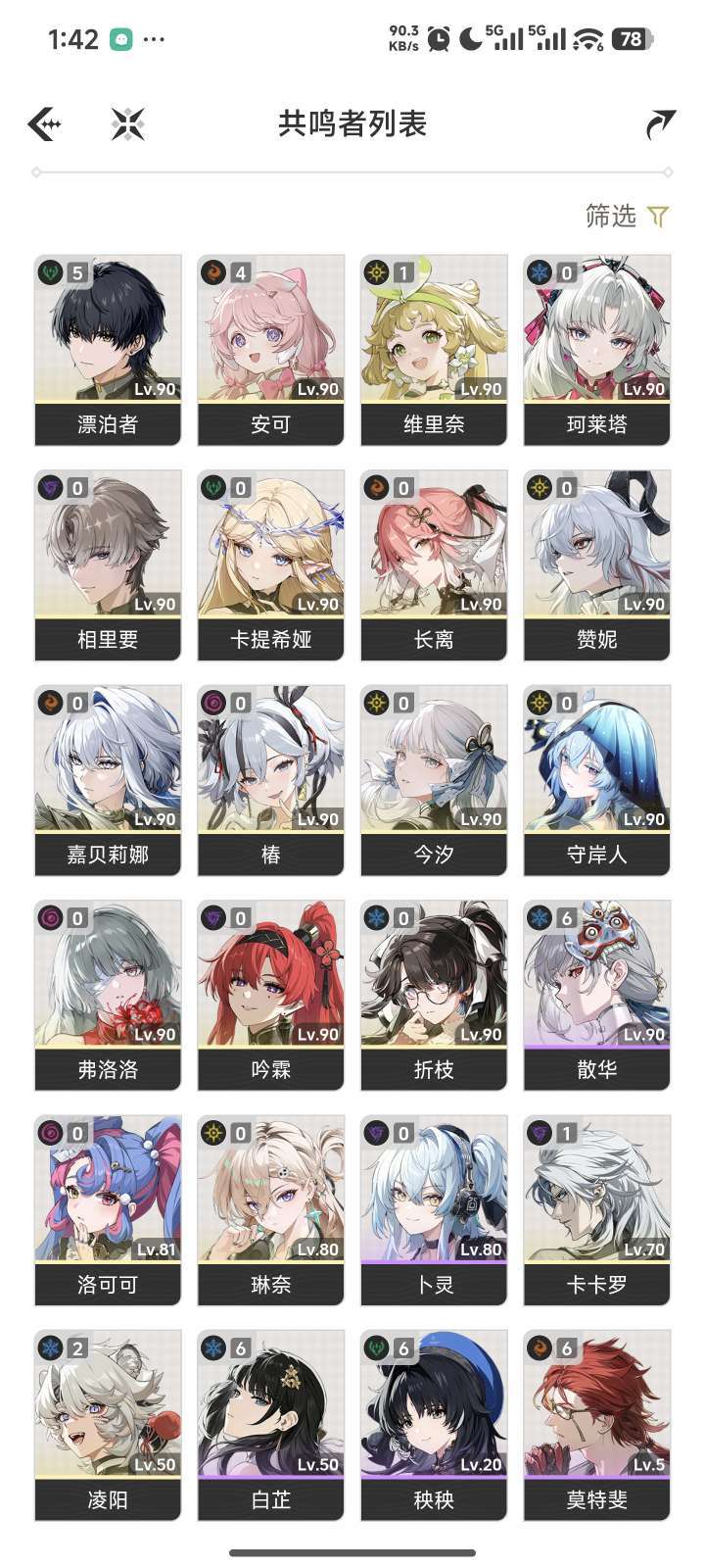 80级满级爽号高练成品 4命安可01今汐 嘉贝丽娜 柯莱塔 相里要 折纸33金16个限定up