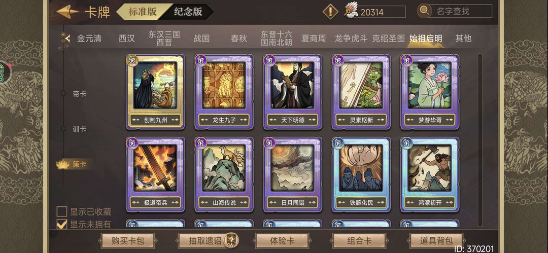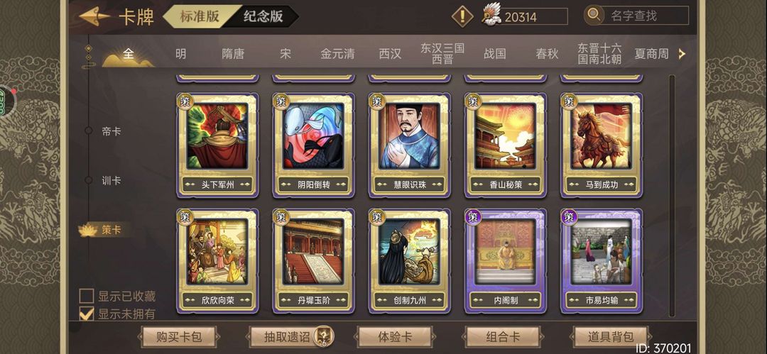限制: 撤单率<50%才可租用此帐号装备描述:禁止私自动用账户物品! 新版本帝卡全收集! 马到成功,丹漆玉阶策卡,最新150策卡欣欣向荣 全红卡,全梦卡,全帝卡,全普通策卡。 强力策卡都有:钓鱼,天发,仁宋,举国同庆,九锡,命数,广厦,长安,一统,阴阳鱼,香山秘策,鸿贤,慧眼,马到成功,丹漆玉阶,欣欣向荣 11个可选天命