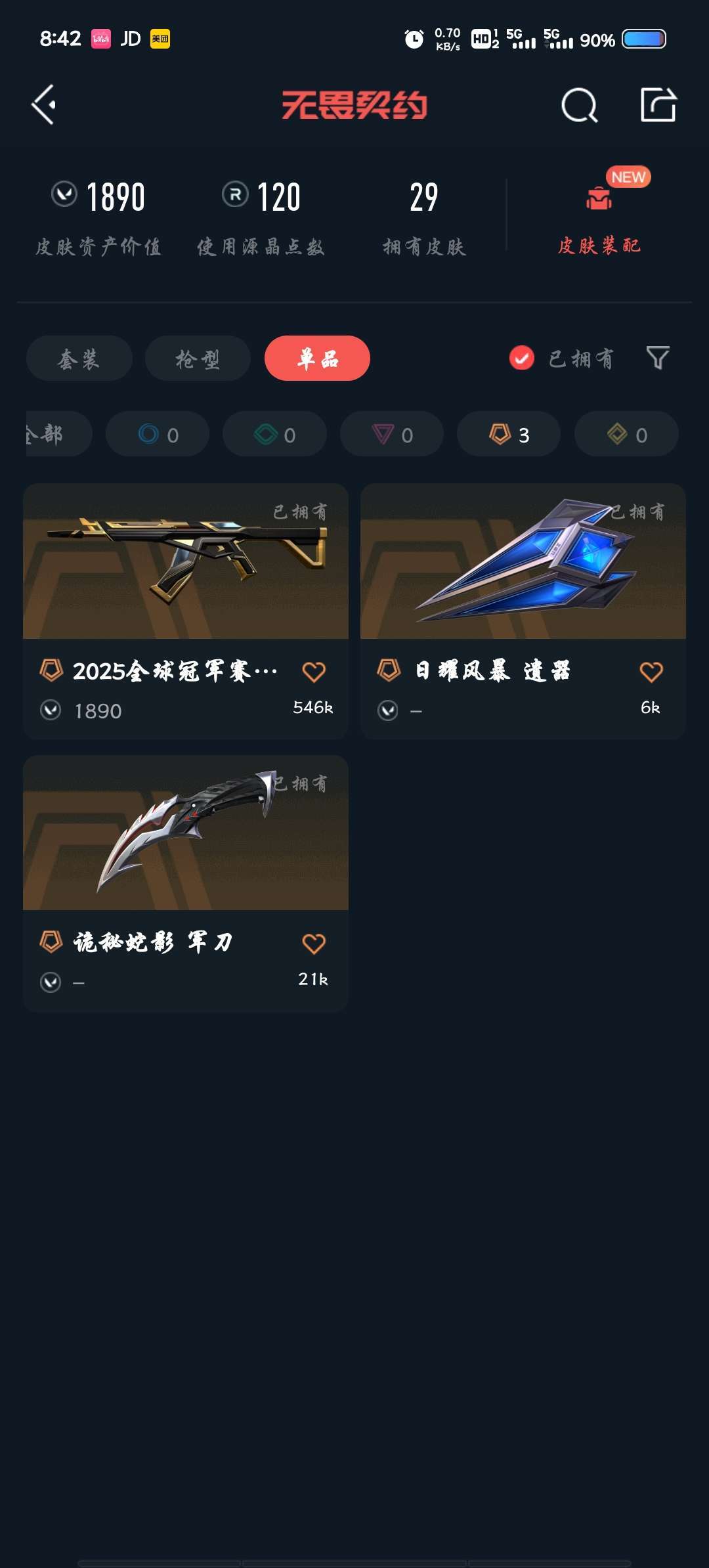 装备描述:该无畏契约账号拥有29款皮肤,皮肤资产价值1890,含2025全球冠军赛武器、日耀风暴遗器、诡秘蛇影军刀等稀有单品,源晶点数剩余120,可正常使用排位赛功能 禁止利用账号进行开挂、使用辅助违规软件诈骗等违规操作。毁号行为涉及毁坏虚拟财产罪及计算机安全罪,请文明游戏素质游戏,让我们共建美好租号平台!请游戏局内保持文明,防止禁言影响他人游戏,祝您玩得愉快!