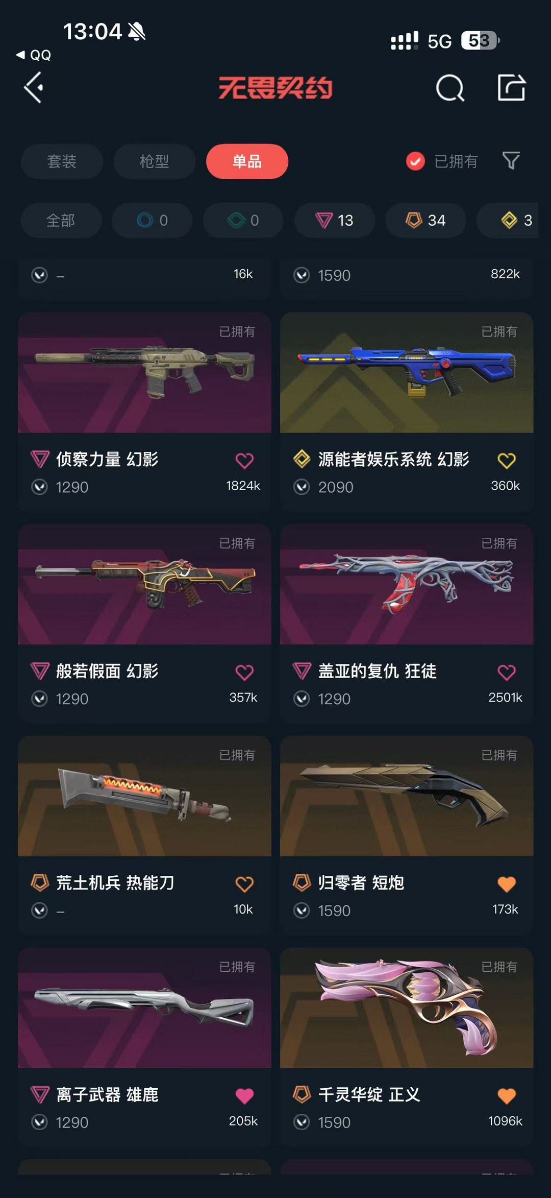 装备描述:3金34橙13紫全英雄除了狂怒和骇灵外都有皮肤,随身武器:(归零者 短炮 炫彩3);(归零者 短炮 炫彩1);(千灵华绽 正义 炫彩2);(千灵华绽 正义 炫彩3);(西部未来 正义 炫彩3);(西部未来 正义 炫彩1);(电音光谱 标配 炫彩3);(电音光谱 标配 炫彩2);(电音光谱 标配 炫彩1) 步枪:(盖亚的复仇 狂徒 炫彩3);(盖亚的复仇 狂徒 炫彩2);(侦察力量 幻影 炫彩2);(侦察力量 幻影 炫彩3);(781-A协议 獠犬 炫彩2);(781-A协议 獠犬 炫彩3);(千灵华绽 幻影 炫彩1);(千灵华绽 幻影 炫彩2);(源能者娱乐系统 幻影 炫彩1);(混沌序曲 狂徒 炫彩3);(混沌序曲 狂徒 炫彩1);(黯夜怪谈 幻影 炫彩3);(黯夜怪谈 幻影 炫彩2);(创·纪元 狂徒 炫彩1);(创·纪元 狂徒 炫彩2);(离子武器//2.0 狂徒 炫彩2);(离子武器//2.0 狂徒 炫彩1);(离子武器//2.0 狂徒 炫彩3);(RGX 11z Pro 狂徒 炫彩2);(RGX 11z Pro 狂徒 炫彩1);(超时空卫队 狂徒 炫彩2);(超时空卫队 狂徒