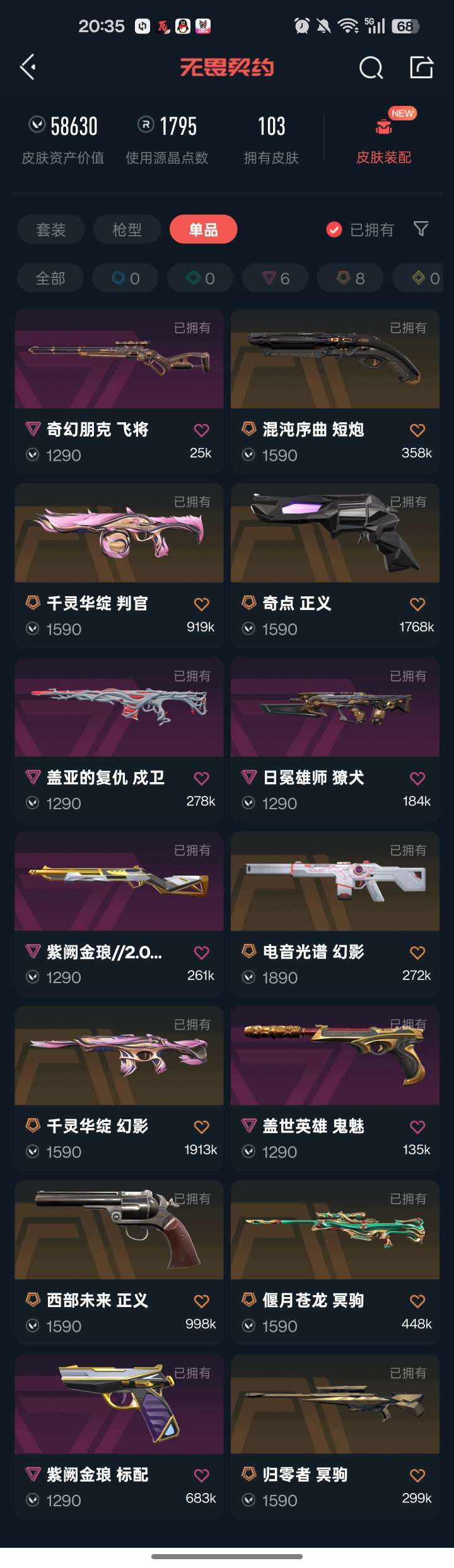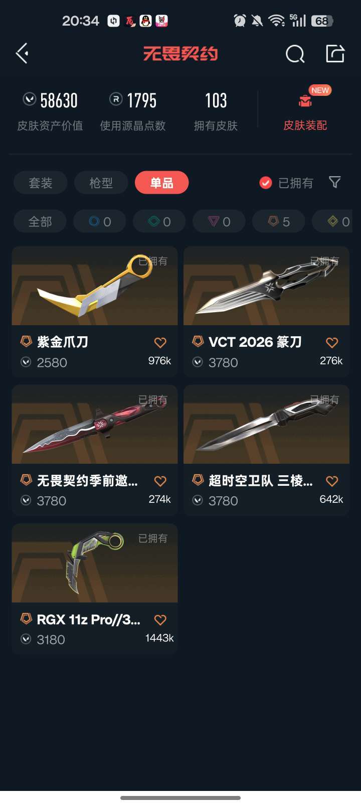 13把狂徒 VCT篆刀+怜悯三棱紫金显卡爪+奇点西部正义 还有其他很多皮肤 5.8w库