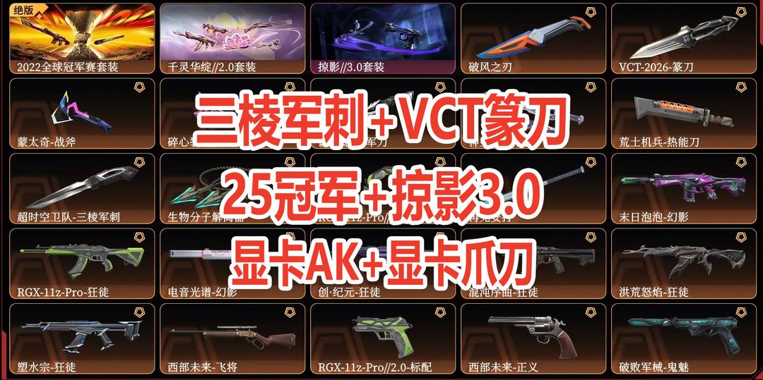 可排位✅顶级10W库存✅超时空三棱刀⭐22冠军套⭐VCT篆刀⭐显卡爪刀显卡AK⭐千灵华绽套⭐掠影3.