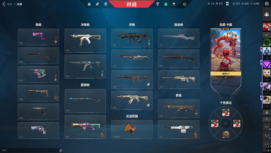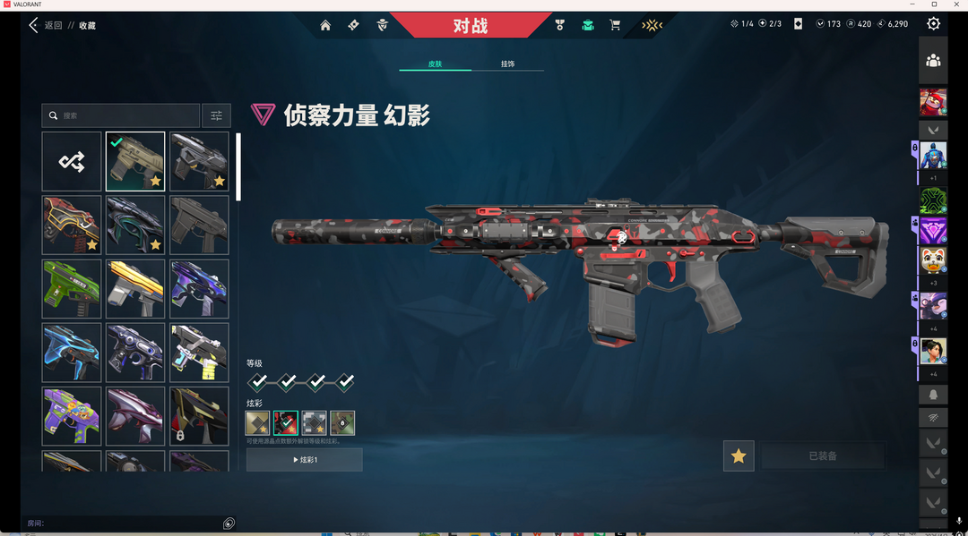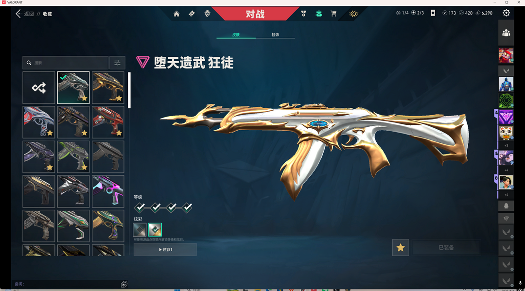 装备描述:随身武器:(盖世英雄 鬼魅 炫彩3);(盖世英雄 鬼魅 炫彩1);(千灵华绽 正义 炫彩1);(千灵华绽 正义 炫彩2);(混沌序曲 短炮 炫彩2);(混沌序曲 短炮 炫彩3);(混沌序曲 短炮 炫彩1) 冲锋枪:(海洋之星 骇灵 炫彩1);(混沌序曲 蜂刺 炫彩2);(混沌序曲 蜂刺 炫彩3);(混沌序曲 蜂刺 炫彩1) 霰弹枪:(盖亚的复仇//2.0 雄鹿 炫彩3);(盖亚的复仇//2.0 雄鹿 炫彩2) 步枪:(盖亚的复仇 狂徒 炫彩3);(盖亚的复仇 狂徒 炫彩2);(侦察力量 幻影 炫彩3);(盖世英雄 狂徒 炫彩2);(盖世英雄 狂徒 炫彩1);(781-A协议 幻影 炫彩2);(781-A协议 幻影 炫彩3);(混沌序曲 狂徒 炫彩2);(混沌序曲 狂徒 炫彩1);(黯夜怪谈 獠犬 炫彩3);(黯夜怪谈 獠犬 炫彩2);(异鳞魔蛇 幻影 炫彩2);(异鳞魔蛇 幻影 炫彩1);(RGX 11z Pro 狂徒 炫彩2);(RGX 11z Pro 狂徒 炫彩1) 狙击步枪:(盖亚的复仇 飞将 炫彩3);(盖亚的复仇 飞将 炫彩1);(盖亚的复仇 飞将 炫彩2);(盖世英雄 冥驹