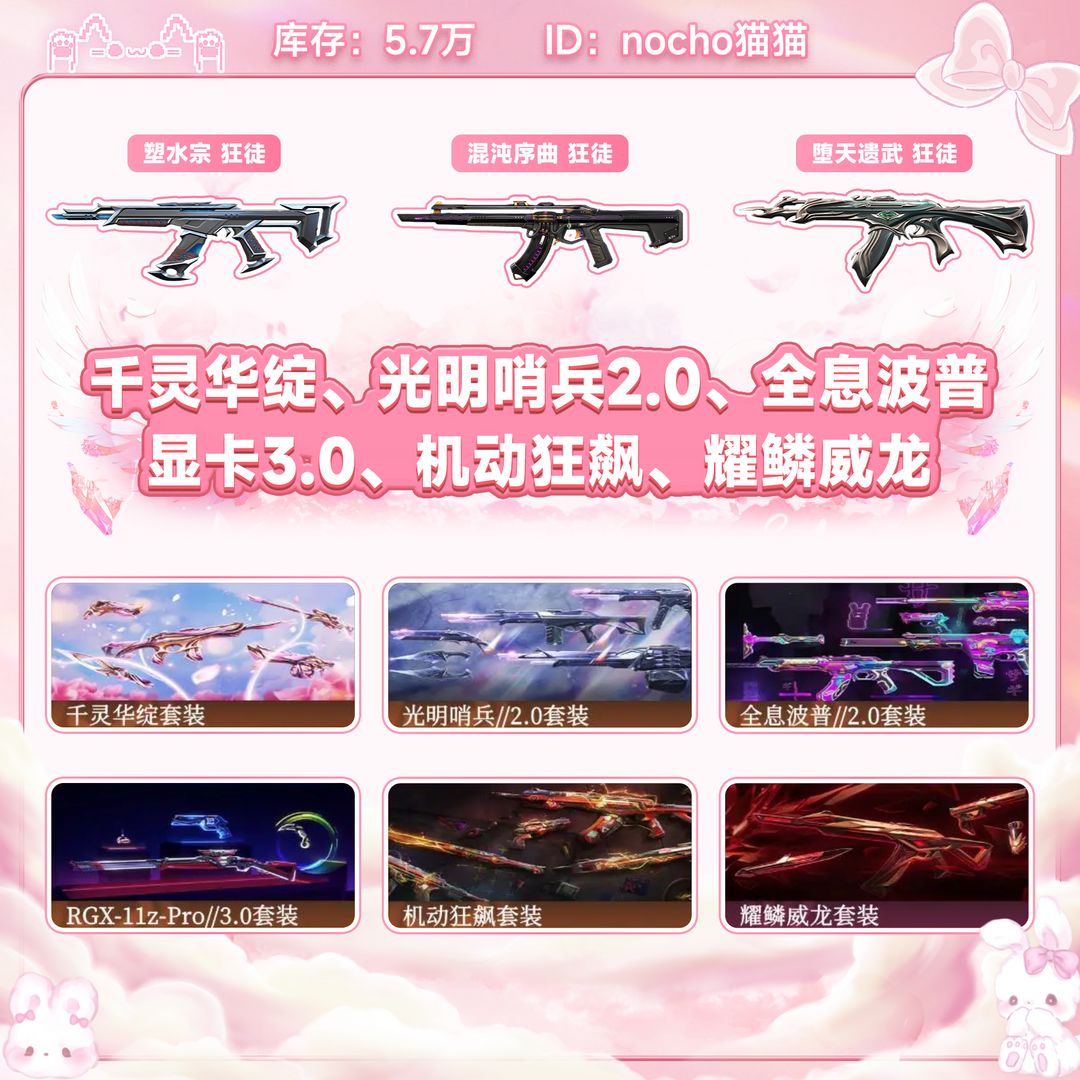 禁排位6万库存❤️女生粉粉枪皮❤️千灵花绽套装❤️光明哨兵套装❤️全息波普套装❤️显卡套装❤️机动套