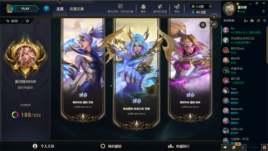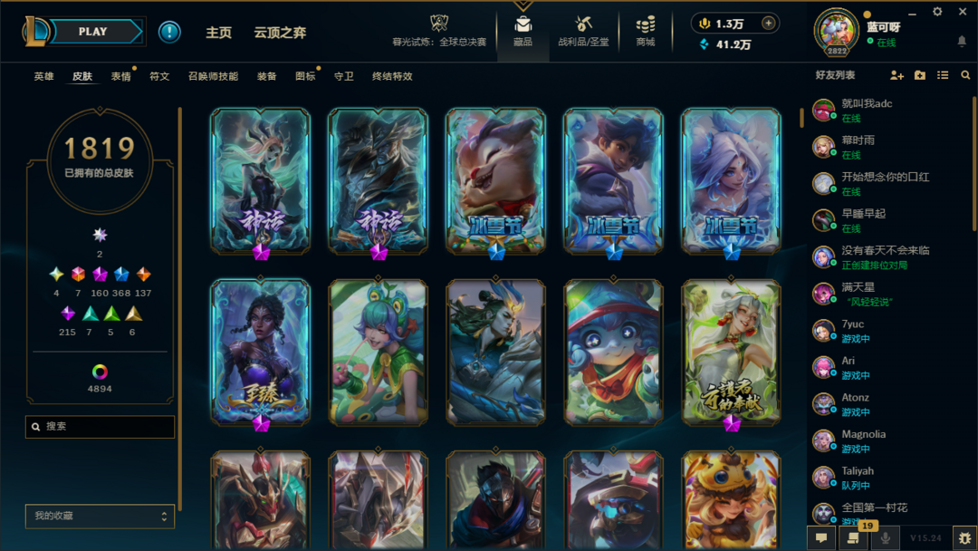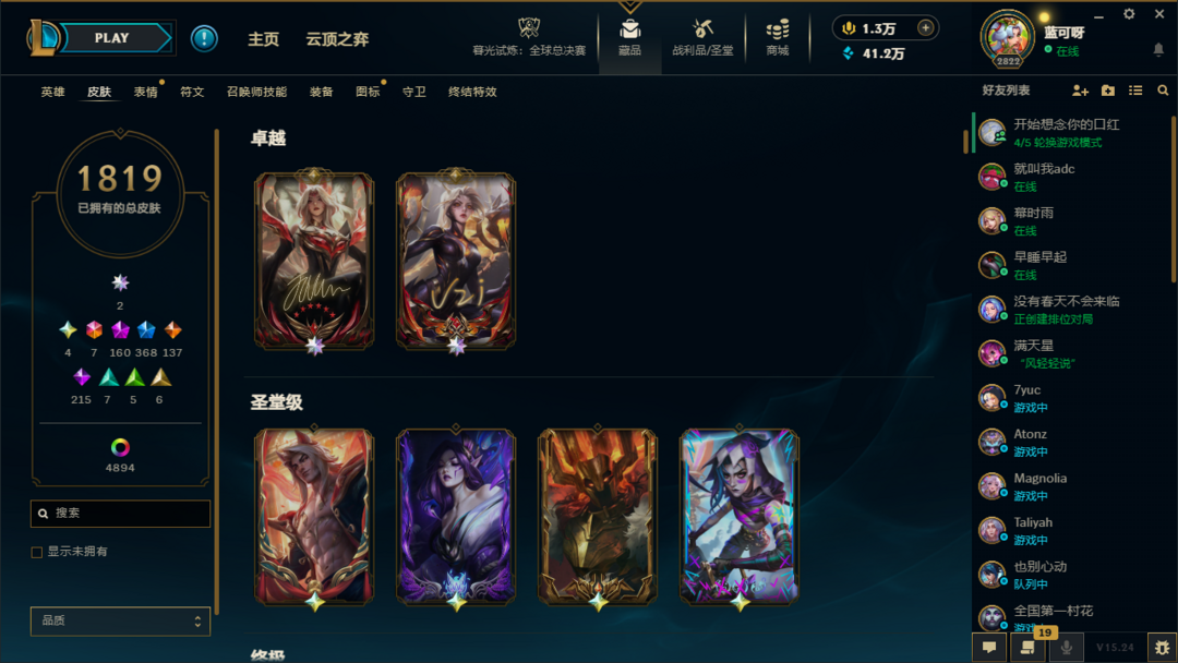 ⭐沉溺暗影⭐1819皮肤+4894炫彩+188臻彩⭐签名卡莎⭐全圣堂⭐小小格温+巴黎棋盘⭐全皮全炫彩