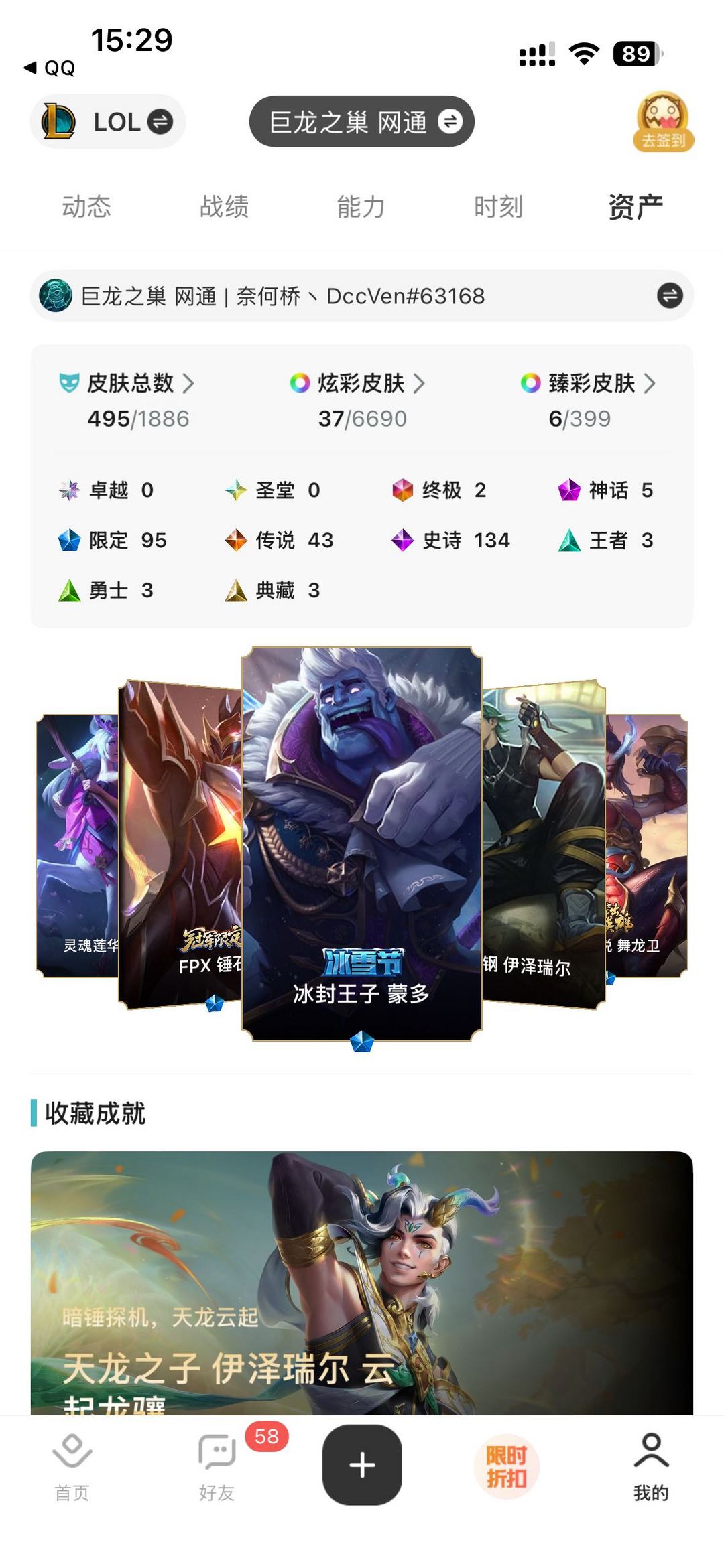 装备描述:英雄165个 头像255个 皮肤500个,炫彩30个 每个英雄的皮肤基本上都有4个以上。(凡是老铁想玩英雄皮肤应有尽有)年限和周年庆皮肤10个以上电玩赛事皮肤都有 希望玩的老铁认真对待此号,不要恶意挂机和有损信誉度的行为