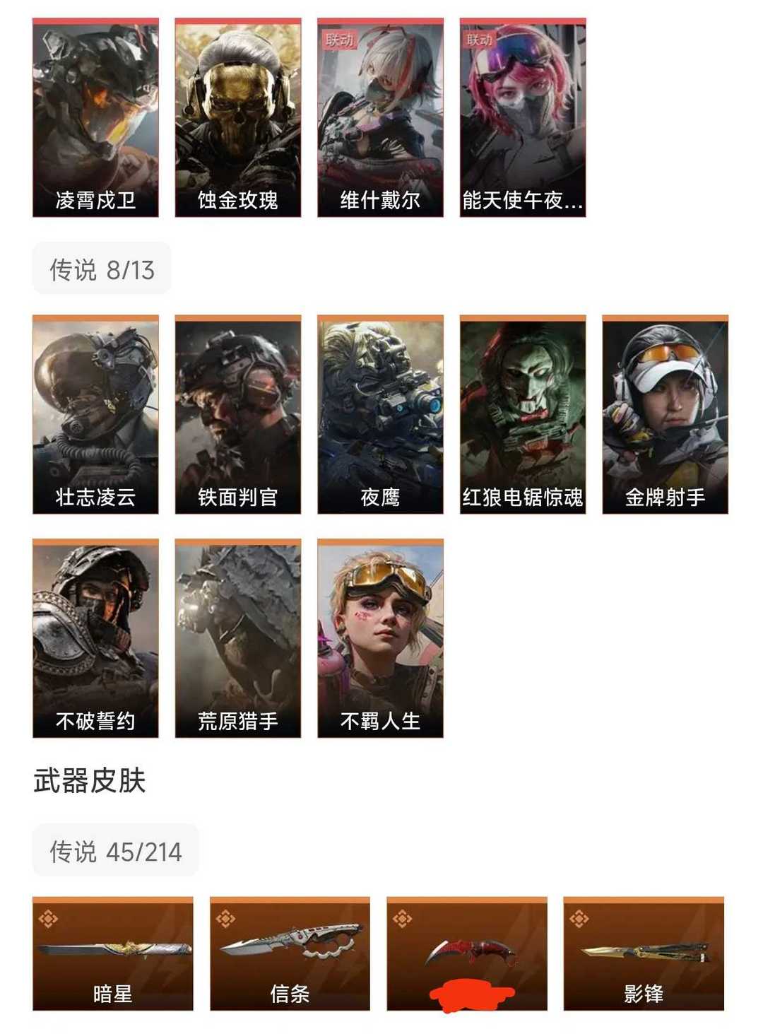 装备描述:4红5刀暗星信条蝴蝶刀赤枭,凌霄茂卫,蚀金玫瑰维什戴尔,女医,45款传说枪皮肤