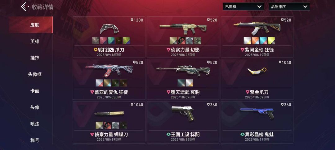 观察期VCT 爪刀 侦察力量 幻影 紫阙金琅 狂徒 盖亚的复仇 狂徒 堕天遗武 冥驹 蝴蝶刀