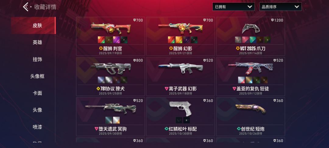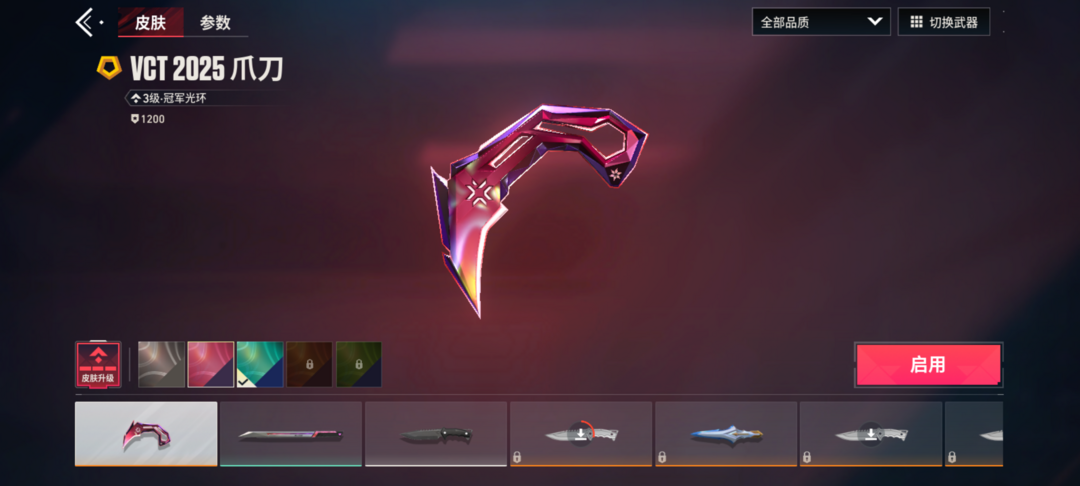 装备描述:近战武器-VCT2025爪刀, 幻影-醒狮,判官-醒狮,獠犬-781协议,狂徒-盖亚的复仇,幻影-离子武器,冥驹-堕天遗武,狂徒-源晶工程,獠犬-创世纪,獠犬-源晶工程,冥驹-创世纪,冥驹-源晶工程,正义-源晶工程,鬼魅-异彩晶棱,标配-红鳞松叶,短炮-创世纪,骇灵-异彩晶棱,戍卫-航空材料,戍卫-本色混搭,飞将-质感轻奢,正义-激流先锋,鬼魅-本色混搭,标配-金鸾之翼,短炮-质感 轻奢,狂怒-质感轻奢,骇灵-航空材料,判官-金鸾之翼,判官-本色混搭,雄鹿-质感轻奢,战神-金鸾之翼,战神-本色混搭