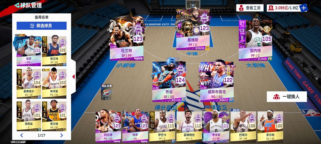 装备描述:满图乔治浓眉 8突一星威少 六突加内特 杜兰特 利拉德 保罗三回忆 超强阵容出租