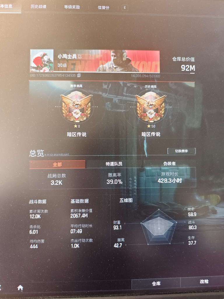 解锁全地图钥匙/仓库价值92m/ 纯币4120w/9格安全箱/4皮肤1刀皮/7个6套5件大白鹅