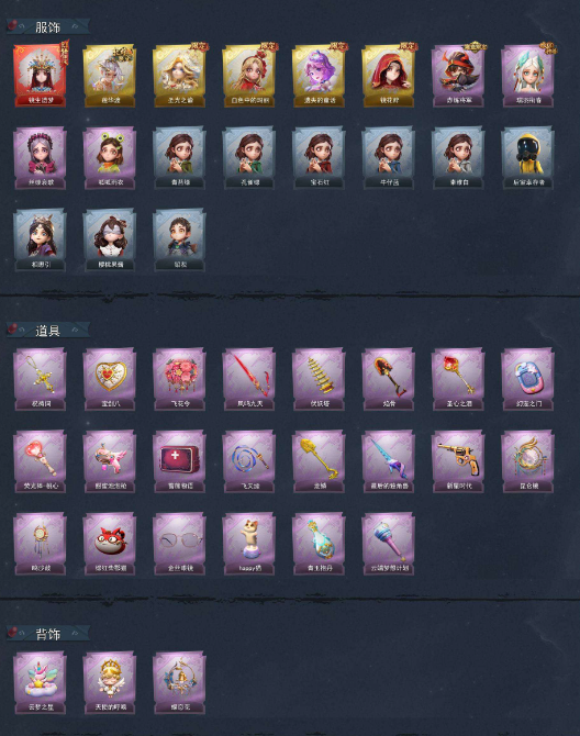 装备描述:【幻梦皮肤】巫铃儿-镜生遗梦 【金色皮肤】逍遥-莲华渡、薇薇安-圣光之谕、爱丽丝-血色中的玛丽、小黄-遗失的童话、巫铃儿-镜花辞 【紫色皮肤】零-赤炼将军、爱丽丝-瑞羽衔春、爱丽丝-丝缕哀歌、小黄-呱呱雨衣 【道具皮肤】铲子-圣心之泪、铲子-焰骨、传送按钮-幻宠之门、桃木剑-凤鸣九天、腰包-绯红柴郡猫、铲子-龙鳞、专业手电-云端梦想计划、腰包-宝剑八、桃木剑-最后的独角兽、夜视仪-金丝眼镜、转轮手枪-新星时代、摸金符-祝祷词、传送按钮-昆仑镜、黄牛能量饮料-青玉抱丹、长鞭-飞天绫、葫芦-伏妖塔、电击枪-甜蜜泡泡枪、额外的背包-飞花令、音响-happy猫 【头饰】鱼头怪头套、烈焰红唇头套、面具马头套、哈士奇头套、萨卡班甲鱼头套、嘻嘻头套、滑稽头套、呆滞头套、卑微头套、小狗蛇点点头套、炙热烧烤、像素朋克墨镜、哞哞牛头套、后室幸存者头套 【背饰】云梦之星、天使的呼唤、蝶恋花 【挂饰】小小玛丽、未竟乐园、天使消失的年代、钗头凤 【动作】鹏友摇、心跳摇、小雨摇、舞台中心、敲门舞、痞帅进行曲、举牌、抬手