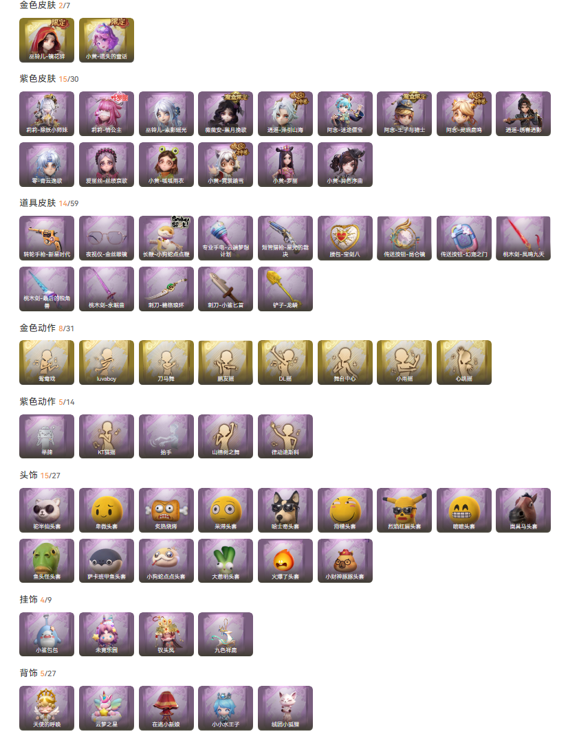 装备描述:15紫双金白泽黑月巫灵儿镜花辞小黄遗失的童话莉莉皮阿莉全皮十四个道具