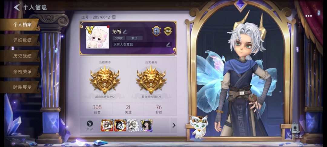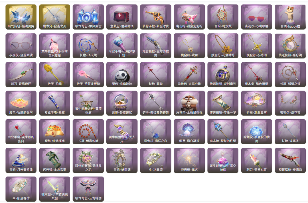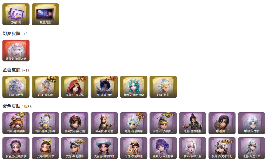 装备描述:红皮 1;金皮 6;紫皮 18;道具皮 57;皮肤:薇薇安 - 沧海之遗,逍遥 - 剑仙,莉莉 - 瑶台梦,薇薇安 - 海月息潮,逍遥 - 莲华渡,零 - 渡鸦公爵,巫铃儿 - 镜花辞,阿念 - 庆宴绮愿,莉莉 - 莓果陷阱,爱丽丝 - 丝缕哀歌,零 - 搬开山,逍遥 - 泽引山海,小黄 - 呱呱雨衣,逍遥 - 绣春逍影,莉莉 - 除妖小师妹,逍遥 - 万迭云华,薇薇安 - 仙锋小姐,薇薇安 - 白光莹,阿念 - 王子与骑士,零 - 青云逸歌,艾伦 - 黎明猎手,巫铃儿 - 琢玉怀乡,爱德华 - 梵卓之礼,临云 - 织锦云程,爱丽丝 - 耀眼的你;道具:桃木剑 - 寂潮之刃,喷气背包 - 晶澜灵翼,铲子 - 赞萌波板糖,腰包 - 私藏的银河,伞 - 沐春颂,折扇 - 赴此良宵,桃木剑 - 绯色遗证,电击枪 - 甜蜜泡泡枪,摸金符 - 海洋之心,传送按钮 - 昆仑镜,音响 - 冬夜暖忆,长枪 - 罪棘,长鞭 - 飞天绫,腰包 - 惊魂娃娃,闪光弹 - 金戈玄铜,音响 - 月光奏鸣曲,铲子 - 龙鳞,黄牛能量饮料 - 无人岸,夜视仪 - 心跳眼镜,转轮手枪 - 新星时代,喷气背包 - 云鸢