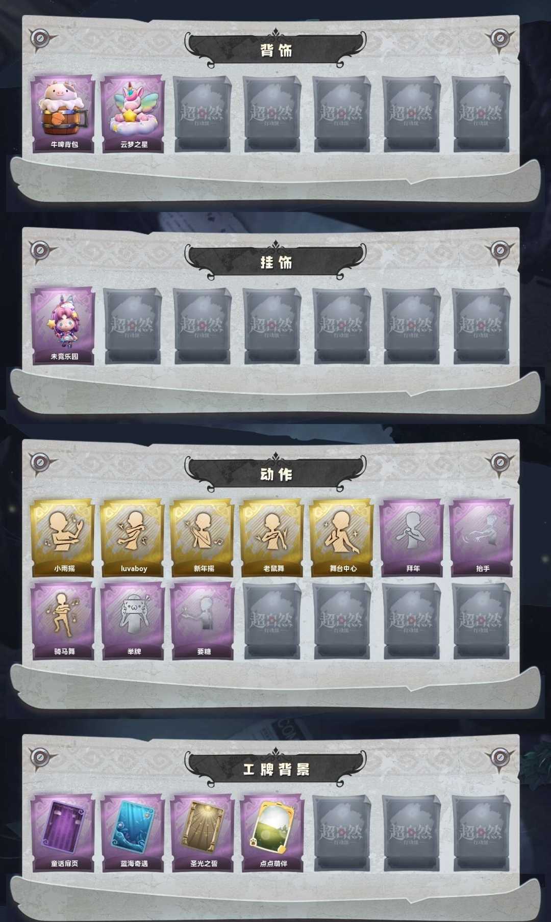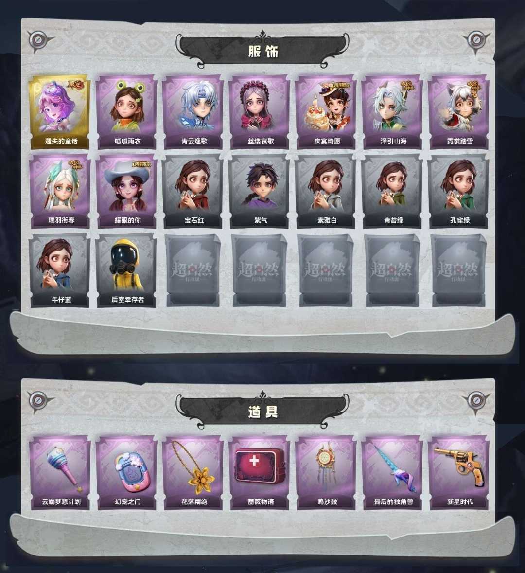 1金♉8紫♉遗失的童话♋泽引山海♋霓裳踏雪⛎瑞羽衔春⛎素影瑶光♑呱呱雨衣♑丝缕哀歌♉庆宴绮愿♉鸣沙鼓