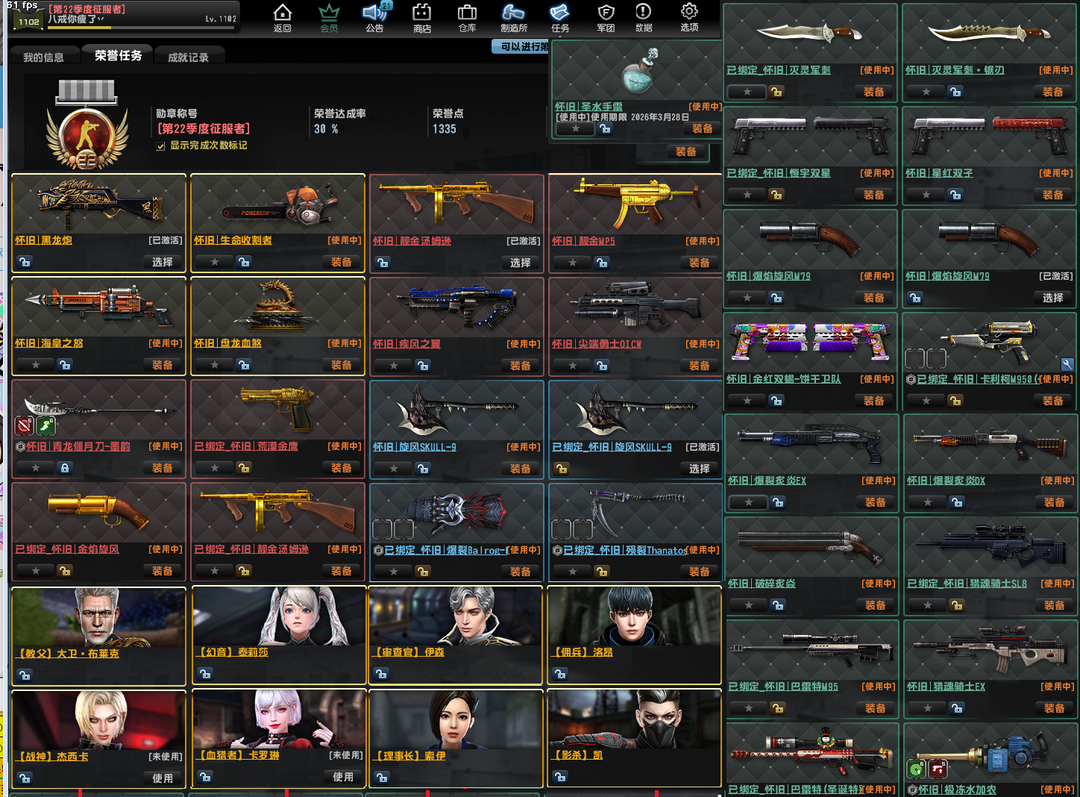 已经去黑雾,重铸怀旧关刀邪皇,电锯,盘龙血煞。海皇之怒。黑龙炮、旋风、金红双蝎,赛季悬赏