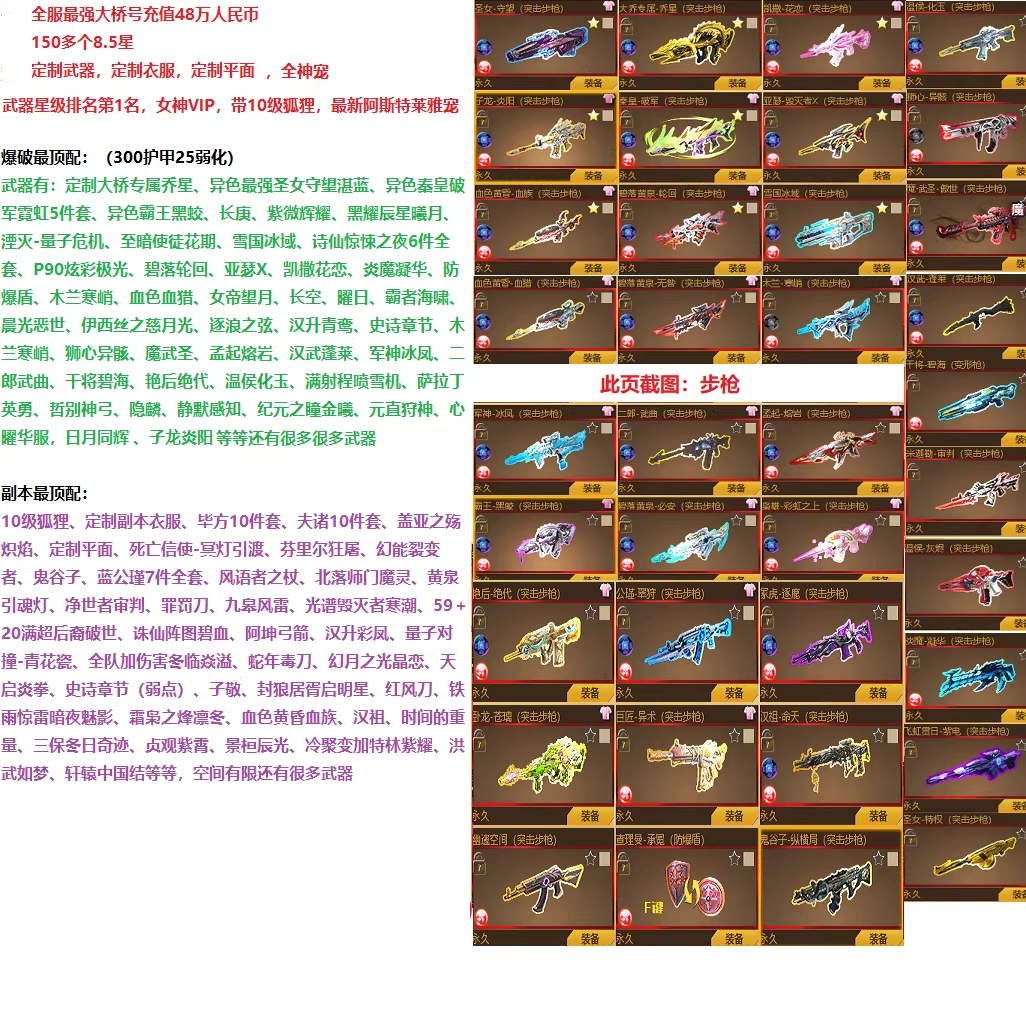 大桥号150个8.5星充值48万武器排名第1名+全神宠10级狐狸+各种10件套+最新异色圣女+全武器