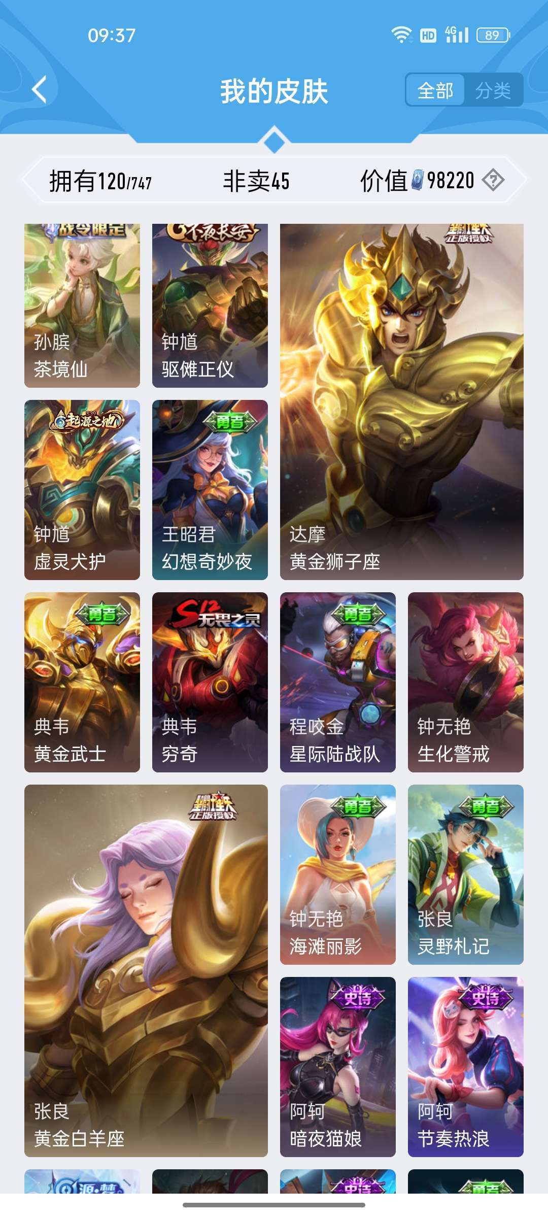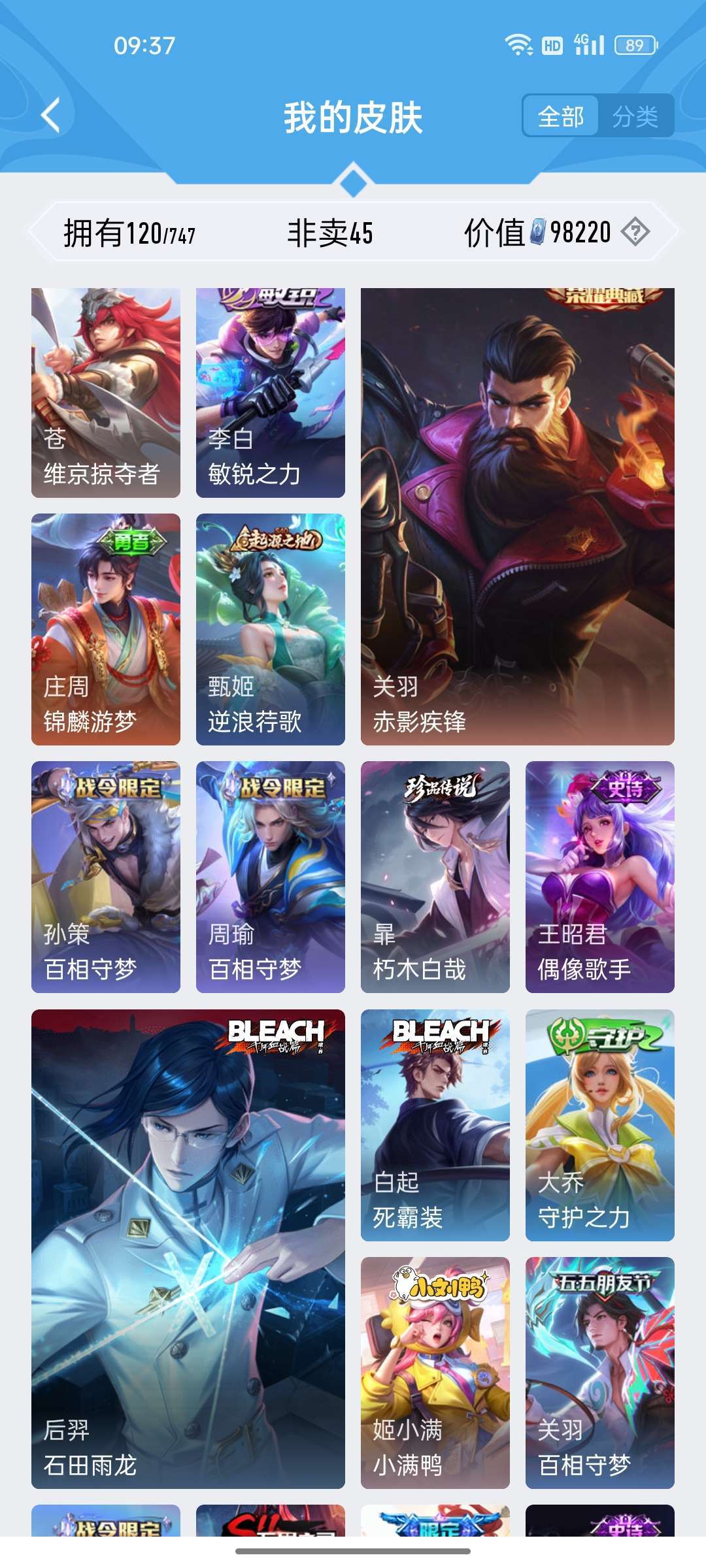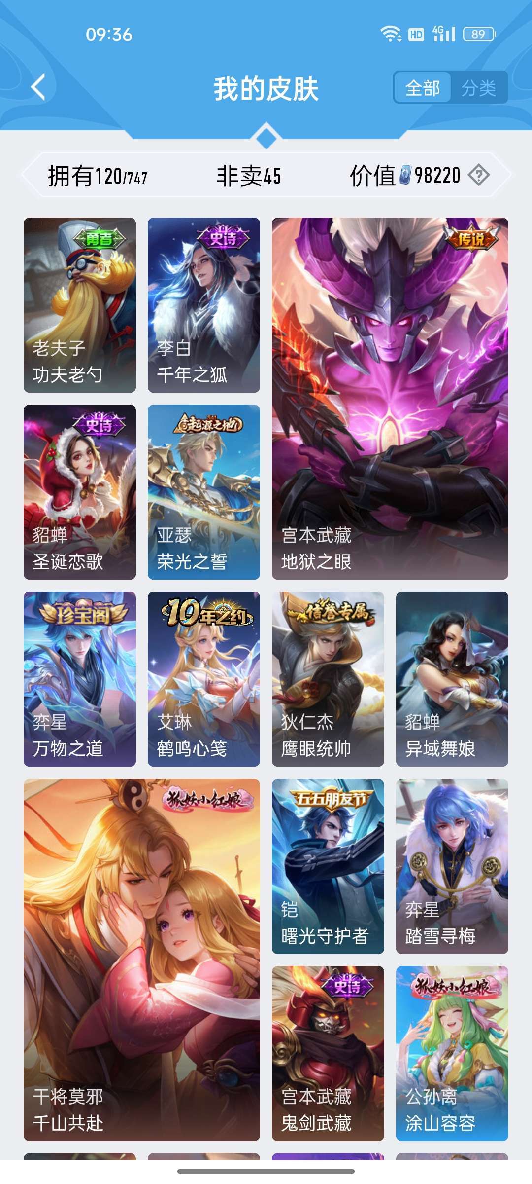 装备描述:关羽荣耀典藏,暃死神联动皮肤,女娲和澜的年限,干将的狐妖小红娘联动,黄金狮子座,地狱之眼