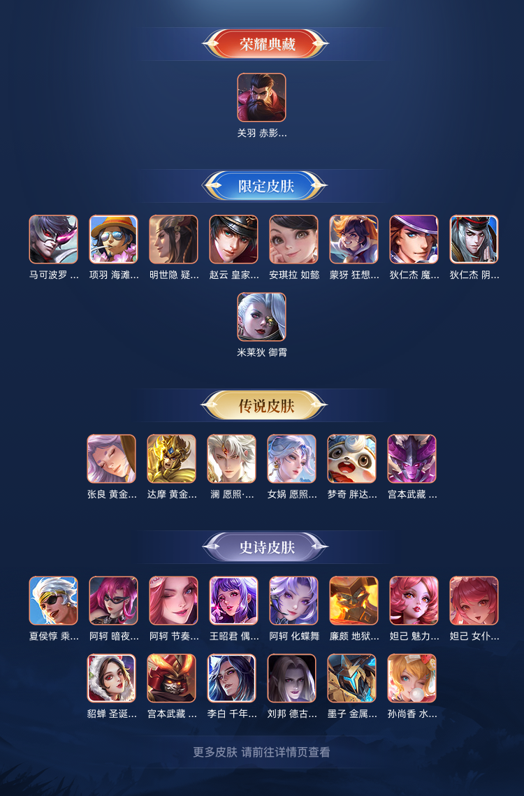 关羽荣耀典藏,暃死神联动皮肤,女娲和澜的年限,干将的狐妖小红娘联动,黄金狮子座,地狱之眼