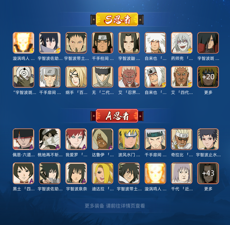 限制: 撤单率<75%才可租用此帐号装备描述:38S九尾水门须佐卡卡西忍战雷影漂泊小南九喇嘛漂泊佩恩忍战带土丨暴怒带土秽土斑白面具咒佐惊门凯