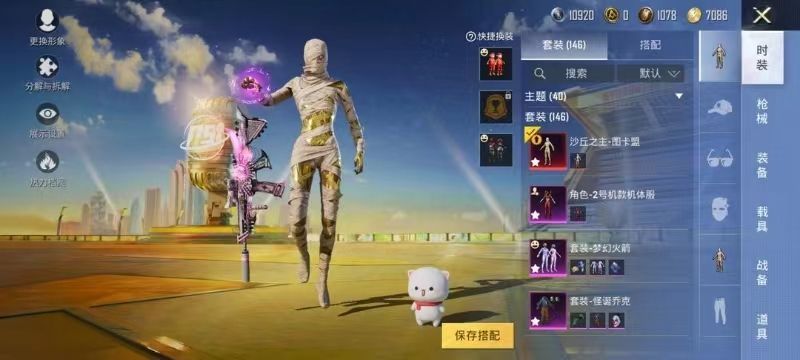 装备描述:沙丘之主木乃伊♥满级超新星♥小丑都市赤蝎金鞋♥红螳螂♥火箭少女♥粉熊背包♥猪猪侠♥沙丘之主飞行器