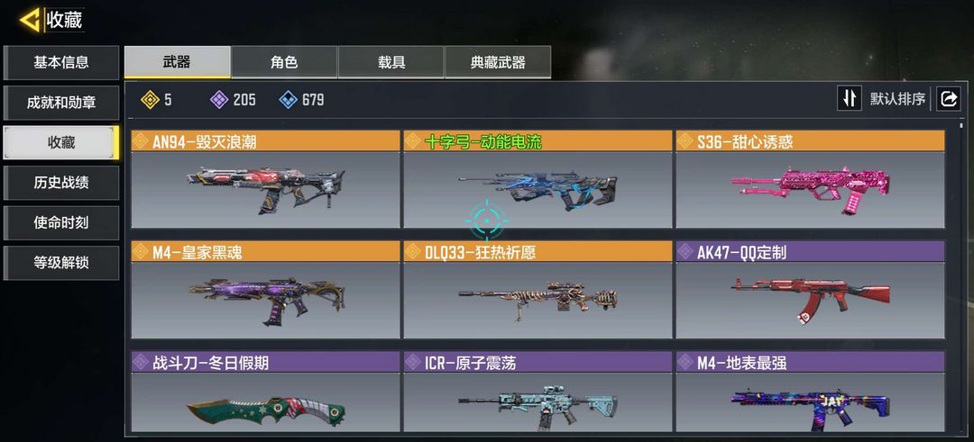 装备描述:4个金色皮肤AN94-毁灭浪潮,十字弓-动感电流,M4-皇家黑魂,S36-甜心诱惑