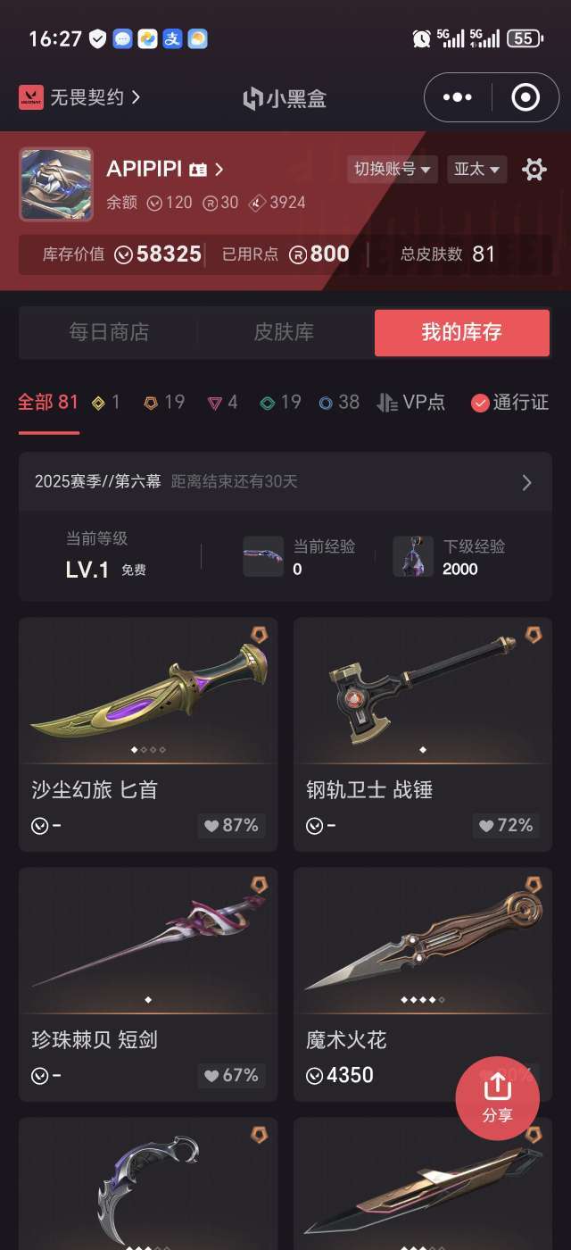 6w库存,刀皮一共九把,有掠夺爪,电光钳,边陲斧,枪皮有23年冠军皮肤。禁止开挂。