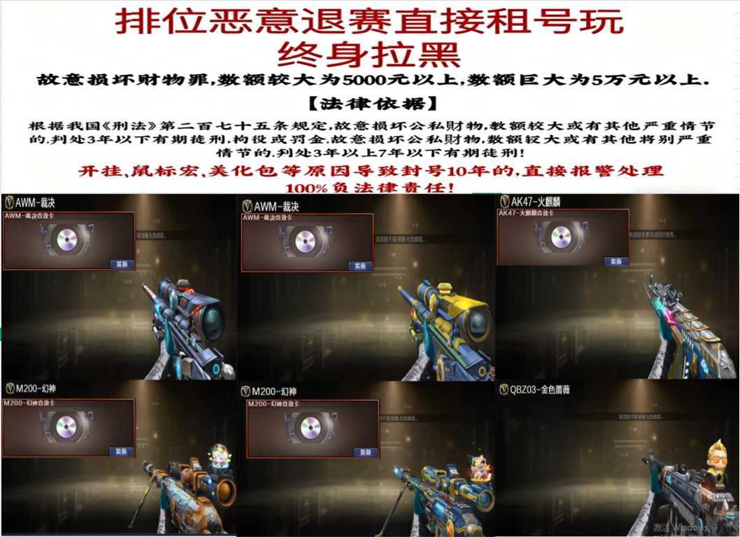 限制: 租号1次及以上 | 撤单率<90%才可租用此帐号装备描述:此号已在当地派出所备案,如有开挂科技选手,必找平台索要租客信息,找团队律师控告到底!