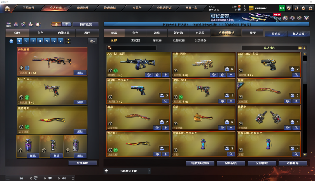 限制: 租号3次及以上 |装备描述:王者武器:王者之鲨;王者雷影;王者风势-觉醒版;炫金无影;王者之光-觉醒版;炫金毁灭 英雄武器:M4A1-千变;传说圣谕;烟雾弹-玄豹;闪光弹-玄豹;高爆手雷-玄豹;9A91-烈火;USP-冥王;AWM-裁决;屠龙;高爆手雷-竞技荣光;烟雾弹-竞技荣光;炽芒蝶刃;闪光弹-竞技荣光;沙鹰-天神;传说幽瞳;Barrett-毁灭;AK47-火麒麟;QBZ03-金色蔷薇;柯尔特-竞技荣光;高爆手雷-云龙;闪光弹-云龙;烟雾弹-云龙;黑武士-锦绣游龙;AK47-黑鲨;手雷-云海游龙;麒麟刺;M4A1-雷神;Kar98K-星神;加特林-炼狱;AA-12-雷霆;龙啸;M4A1-黑骑士;COP 357-幻灵;烟雾弹-幻灵;M4A1-青龙;M200-幻神;AN94-超新星;无影-神兵利器;AWM-天龙 角色:关小雨;猎狐者;曼陀罗;救世主-X;灵狐者-职业经理;麻雀;剑齿虎-X;圣诞潘多拉-X;王者凌霄;嘉年华灵狐 道具:冲锋枪弹匣;炫彩背包;绿色巨人;灵魂忍者;迷雾幽灵;疯狂宝贝;防化服;C4工具钳;手雷包;防弹衣;防弹头盔;超级护目镜;M4A1-雷神音效卡;M4A1-黑骑士音效卡;夺命之镰;防化服;