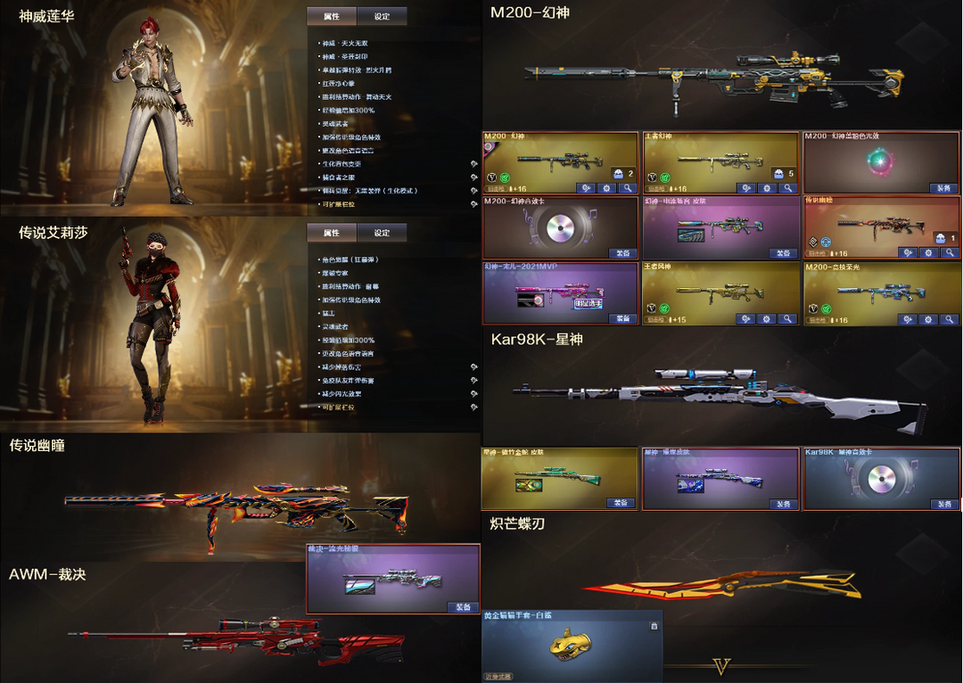 传说幽瞳艾莉莎神威莲华♉幻神6皮宠儿音效卡+星神2皮音效卡裁决✅幻影白虎QBZ蔷薇⚡6满副炽芒鲨臂