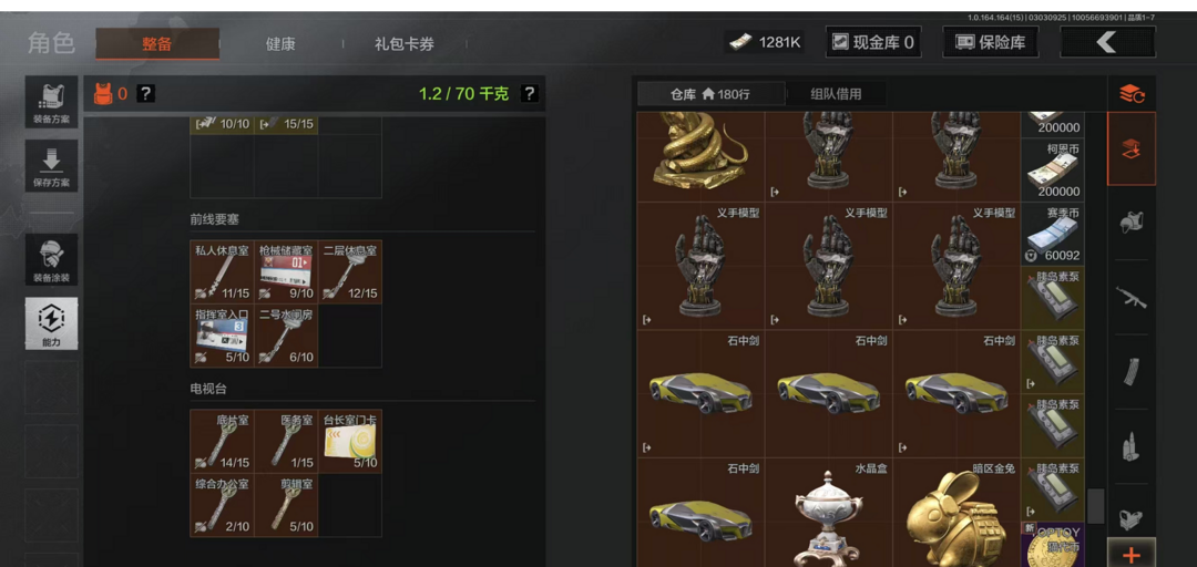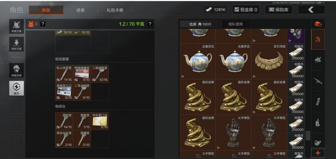 仓库价值1281K✨老板打手第一选择✨钢枪过瘾顶级装备✨子明刀·绣春盘蛇金像古董茶壶宝石项链义手模