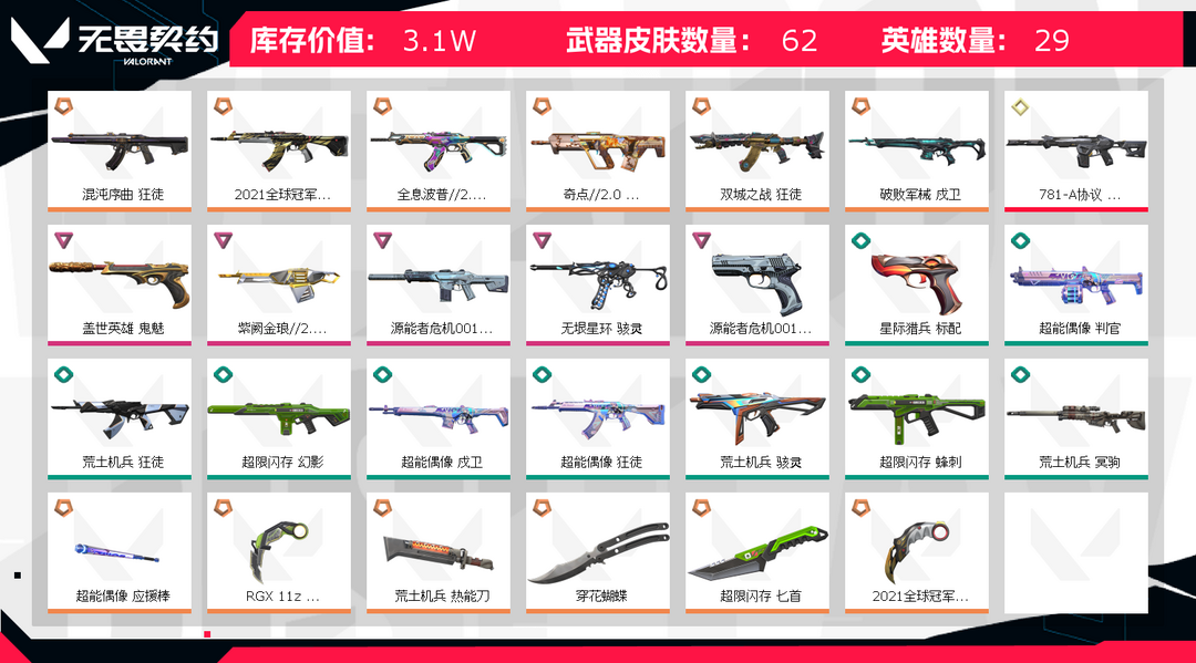 3W库存可排位+21冠军+剥皮+显卡爪刀+混沌狂徒+781幻影+全息狂徒+奇点狂徒