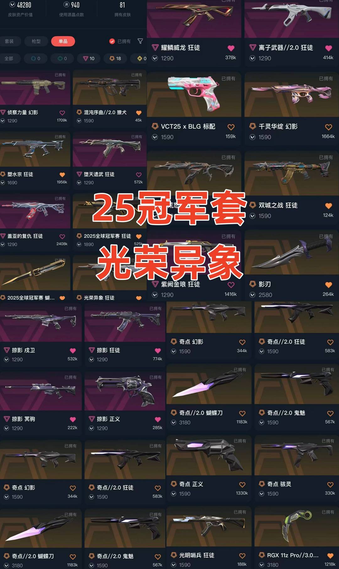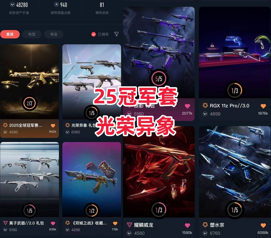 可排✅25冠军套光荣异象⚡显卡爪奇点蝴蝶刀⚡离子2.0盖亚塑水宗弃王紫金⚡双城之战流脓掠夺⚡莲花侦查