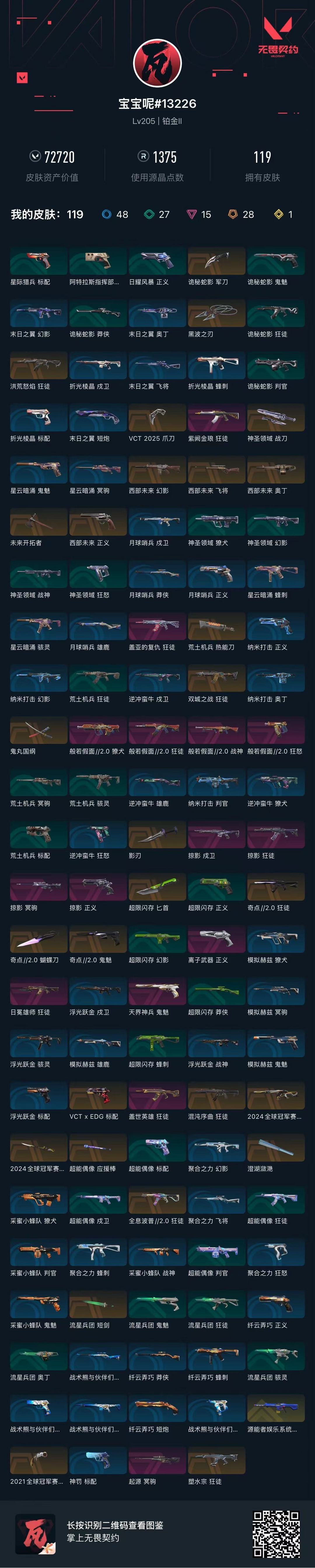 装备描述:该无畏契约账号等级Lv205,段位,拥有119款皮肤,皮肤资产价值72720,使用源晶点数1375。涵盖“战栗死神”“阿拉特斯指南”“日冕风暴”“诡秘蛇影”“荒野怒放”“折光棱镜”“末日之翼”“西部未来”“未来开拓”“月球暗兵”“神圣领域”“凌云海啸”“纳米打击”“荒土机甲”“逆冲蛮牛”“双域之战”“鬼丸国纲”“般若假面/2.0”“影刃”“掠影”“超阈闪存”“奇点/2.0”“日冕通缉”“浮光跃金”“天界神兵”“模块机械”“VCT 2025”“2024全球冠军赛”“超能偶像”“聚合之力”“采蜜小队”“流星兵团”“纤云弄巧”“战术黑号伙伴们”“2021全球冠军赛”“赵源”“堕水者”等多系列枪械皮肤,还有多款刀具皮肤,风格多样,无论是喜欢科幻风、复古风还是竞技风的玩家都能找到心仪的皮肤,让你在对局中尽显个性,快来租赁体验吧!