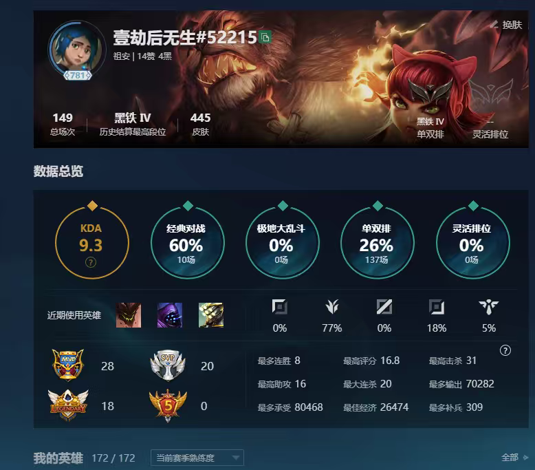❤️全皮 757❤️ 原皮 445❤️全英雄❤️极品负胜率号❤️真实段位黑铁 4 ❤️ 可排位❤️